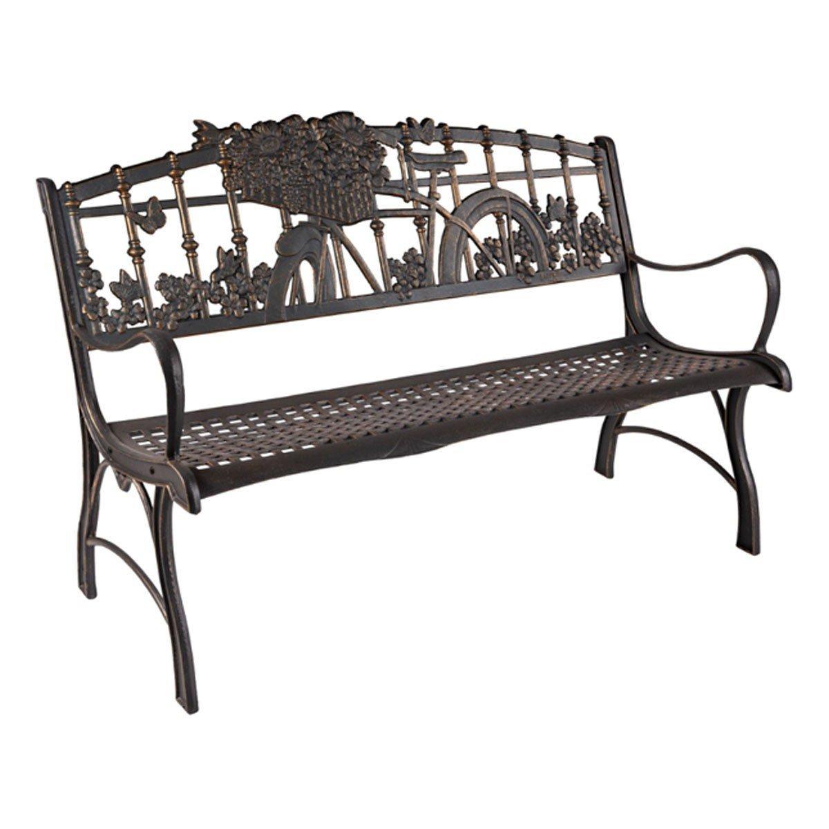 This brand new cast iron design features a vintage bicycle complete with a basket of flowers against a wrought iron fence. Fluttering butterflies and feeding hummingbirds amidst cheerful wildflowers complete the idyllic scene. This artist-designed bench is finished with a bronze powder coat and hand painted gold highlights.