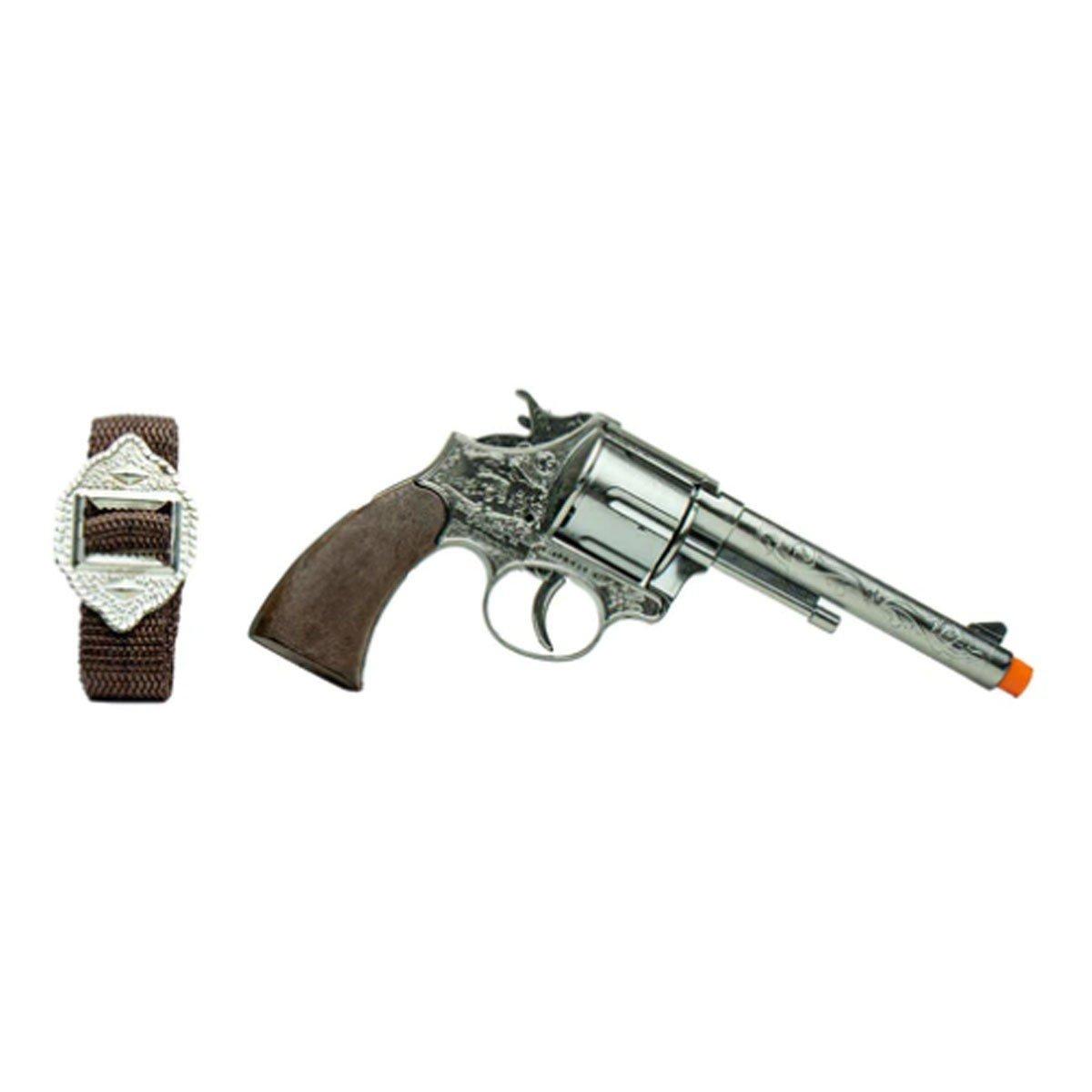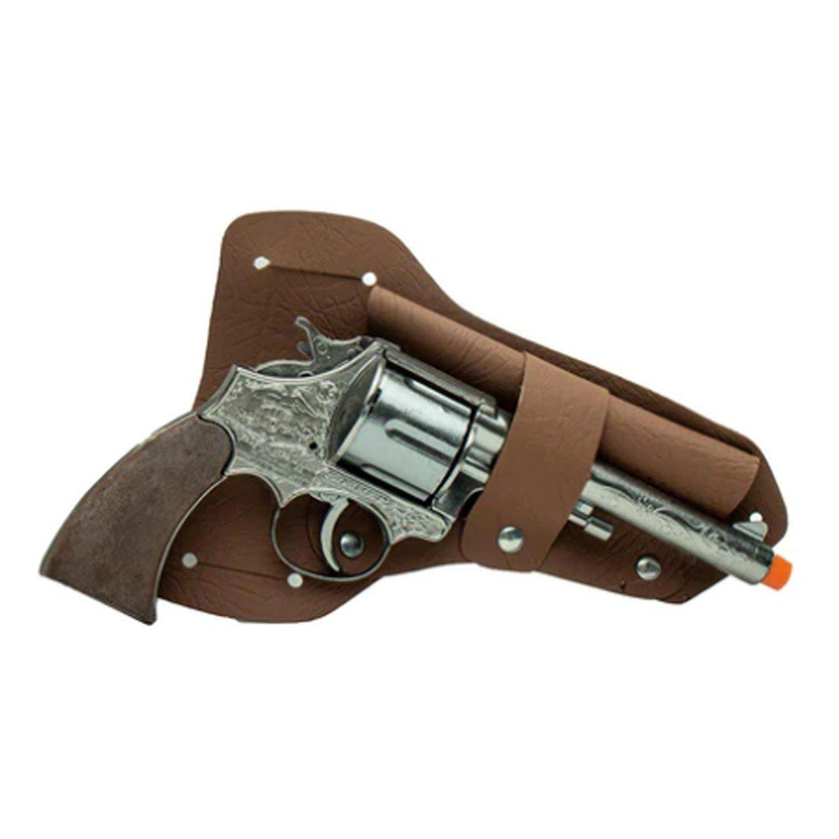 Jesse James Holster Set includes a vinyl holster, belt, and toy die-cast metal pistol. Stylish Jesse James Holster Set fires our signature 12 shot action ring caps. Designed after the original pistols of the Wild West era. Constructed with solid die-cast metal that looks like real antique metal and quality plastic that looks just like real wood. Makes great Theatrical Props.