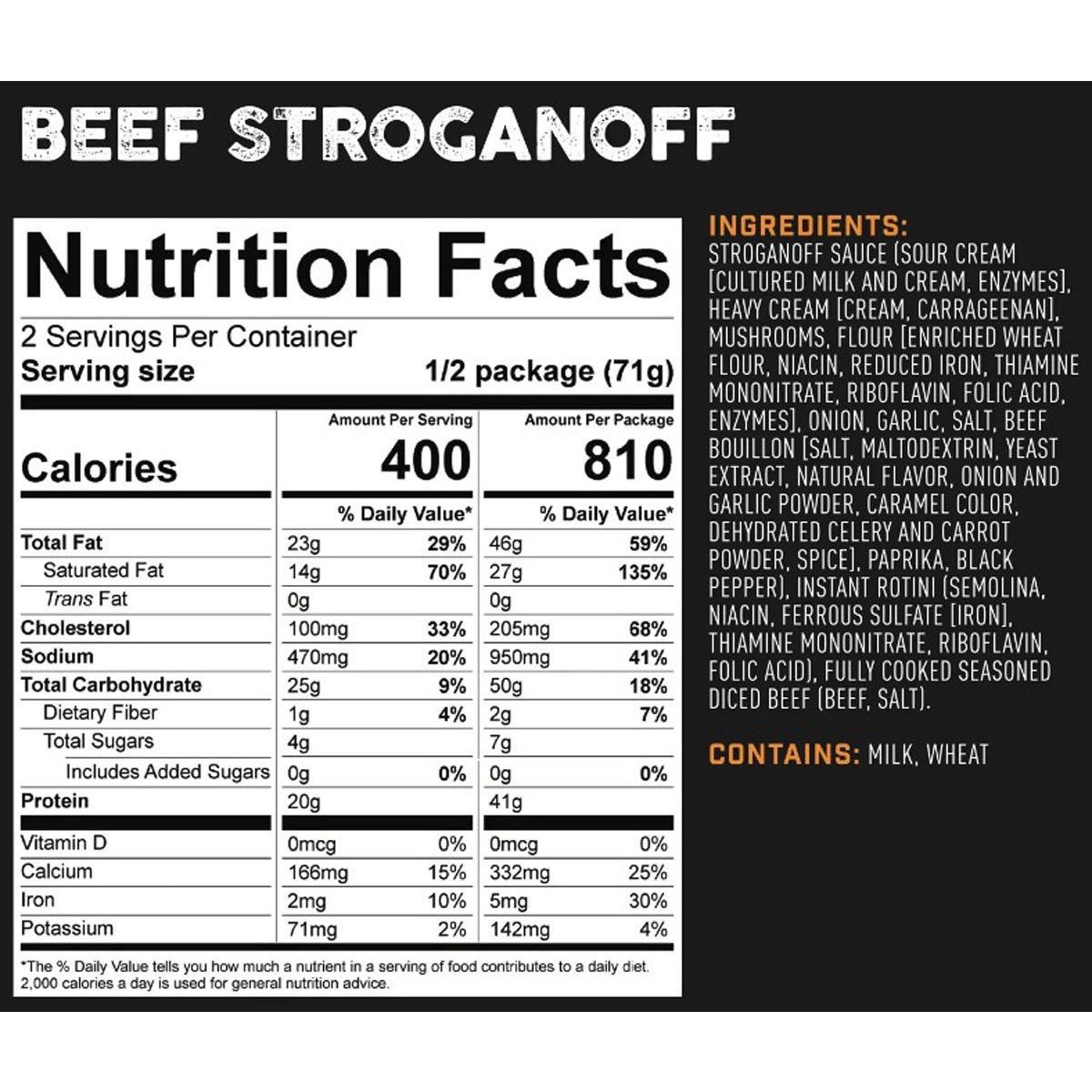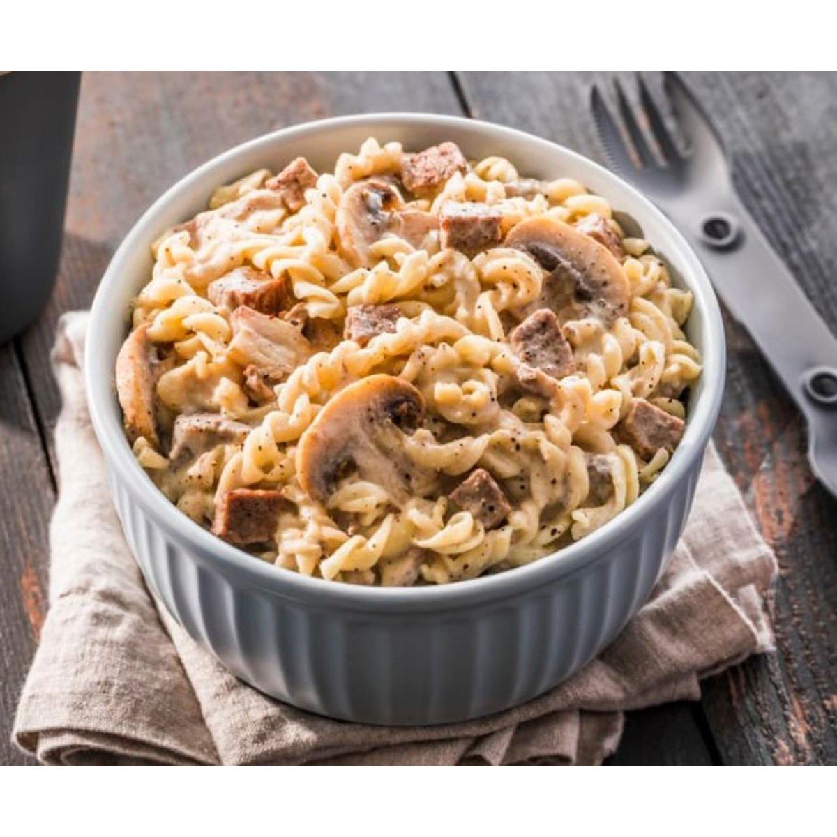 After a long day of following your compass, settle down with some home-style stroganoff mixed with firm spiral noodles, real ground beef, mushrooms, spices, and pure goodness. Now how do we do that? By only using premium, freeze-dried, all natural ingredients that keep their shape, taste, and nutritional value. Giving you 41 grams of protein, 30% of your daily iron, and 25% of your daily calcium, just add 3/4 cups of water and restore your energy and get ready for the next stage of your adventure.