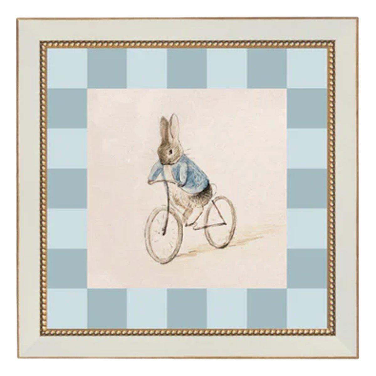 The Petal Lane Checkered Biking Bunny Print features a playful bunny riding a bike with a fun checkered pattern. Its whimsical design and vibrant colors bring a cheerful, lighthearted touch to any space.