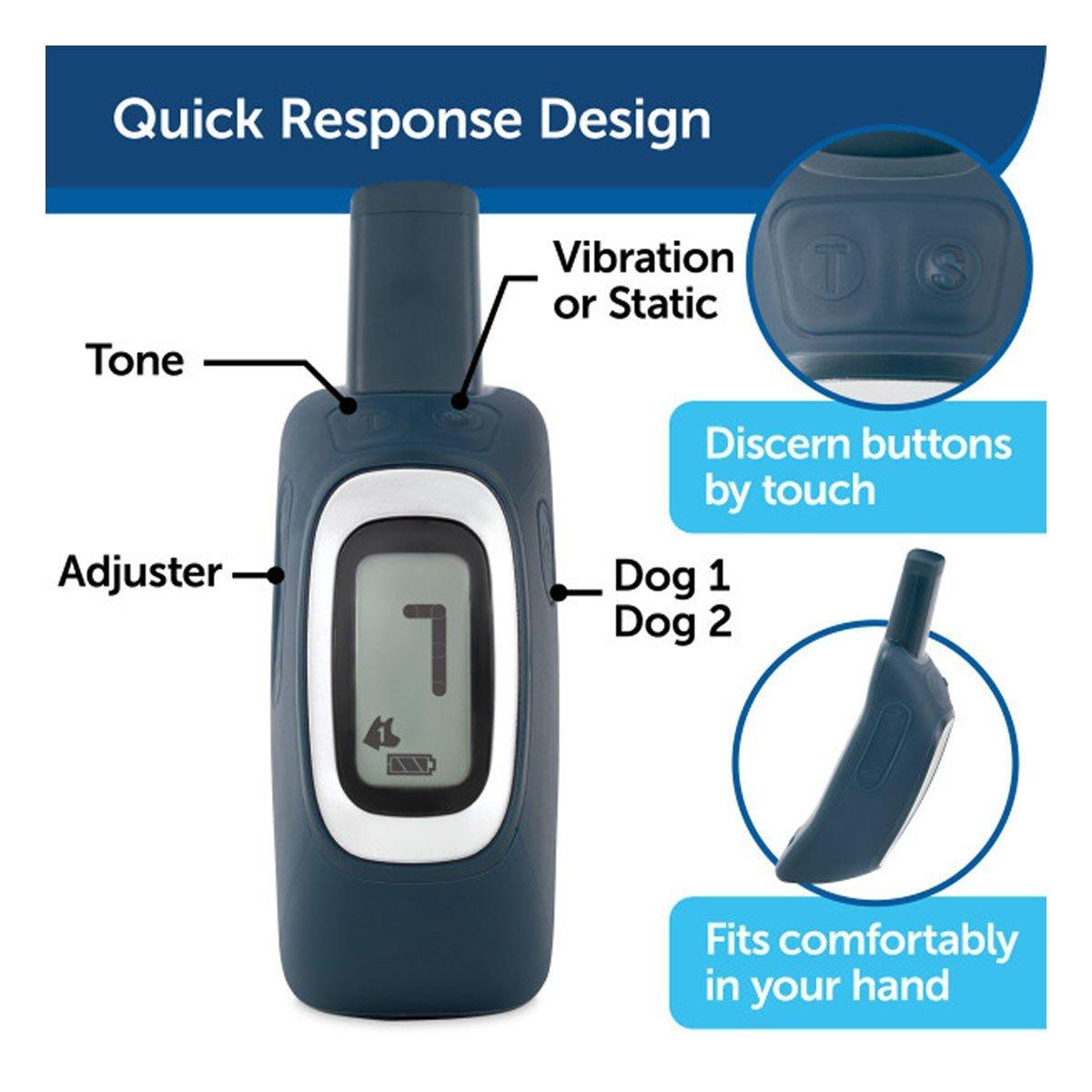 Created for home and backyard training, the 300 Yard Remote Trainer is a medium-range trainer for medium to large dogs. The 300-yard range is perfect for giving your best friend a little freedom while still keeping in touch. The remote fits comfortably in the palm of your hand, and we specifically designed the buttons to be intuitive, so they’re easy to remember and right where you expect them to be. The large font display is easy to read any time of day or night. This training system is durable enough to survive even your most unpredictable adventures. The collar is polyester, and the collar and remote transmitter are waterproof – perfect for spontaneous puddle jumping. Your pet deserves the best. Trust PetSafe® to help keep your pet healthy, safe and happy.