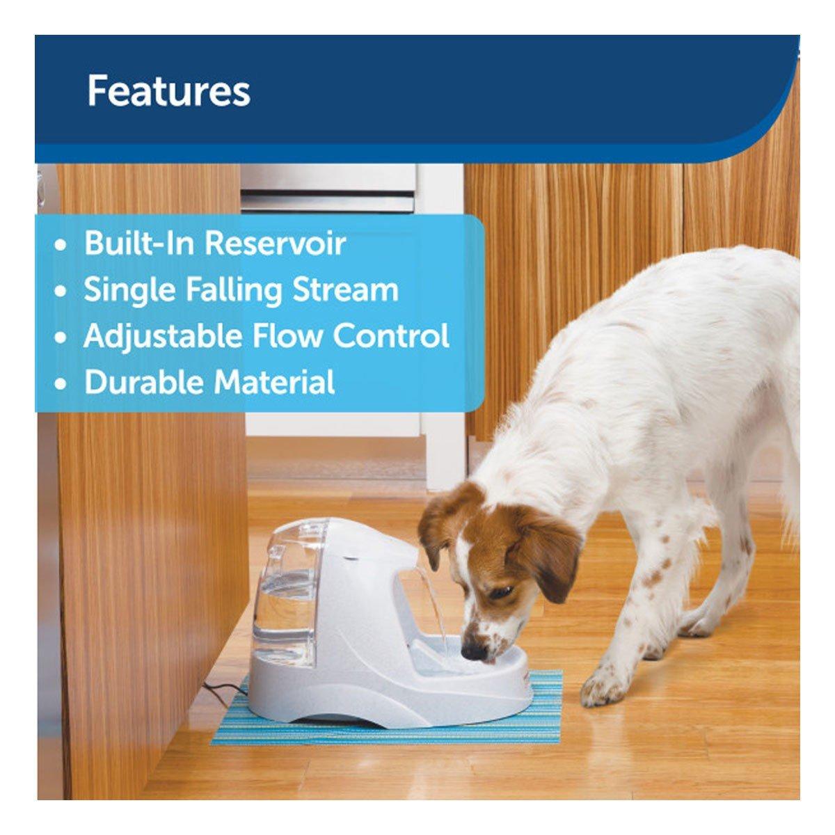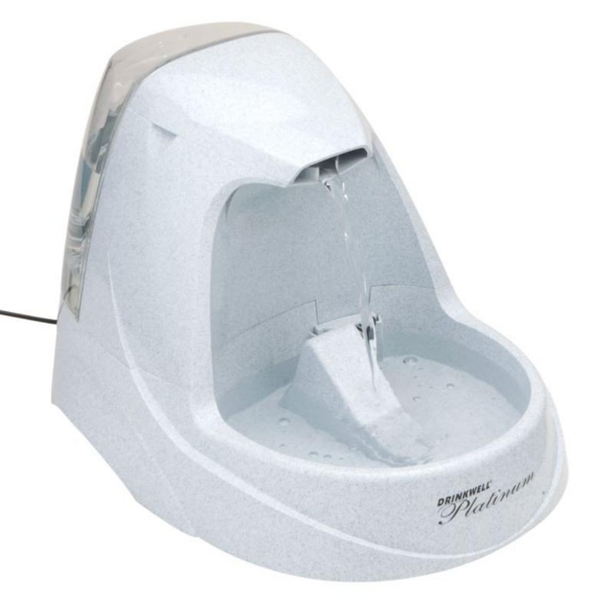 The PetSafe Drinkwell® Platinum Pet Fountain gives your pet 168 ounces of fresh, filtered water. The activated carbon filter removes bad tastes and odors, while the free-falling stream of water entices your pet to drink more. The built-in reservoir increases capacity and makes refills easy. The snap-on reservoir lid and rubber feet on the bottom of the fountain prevent sliding and tipping.