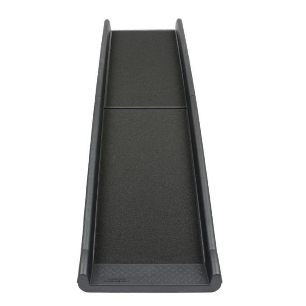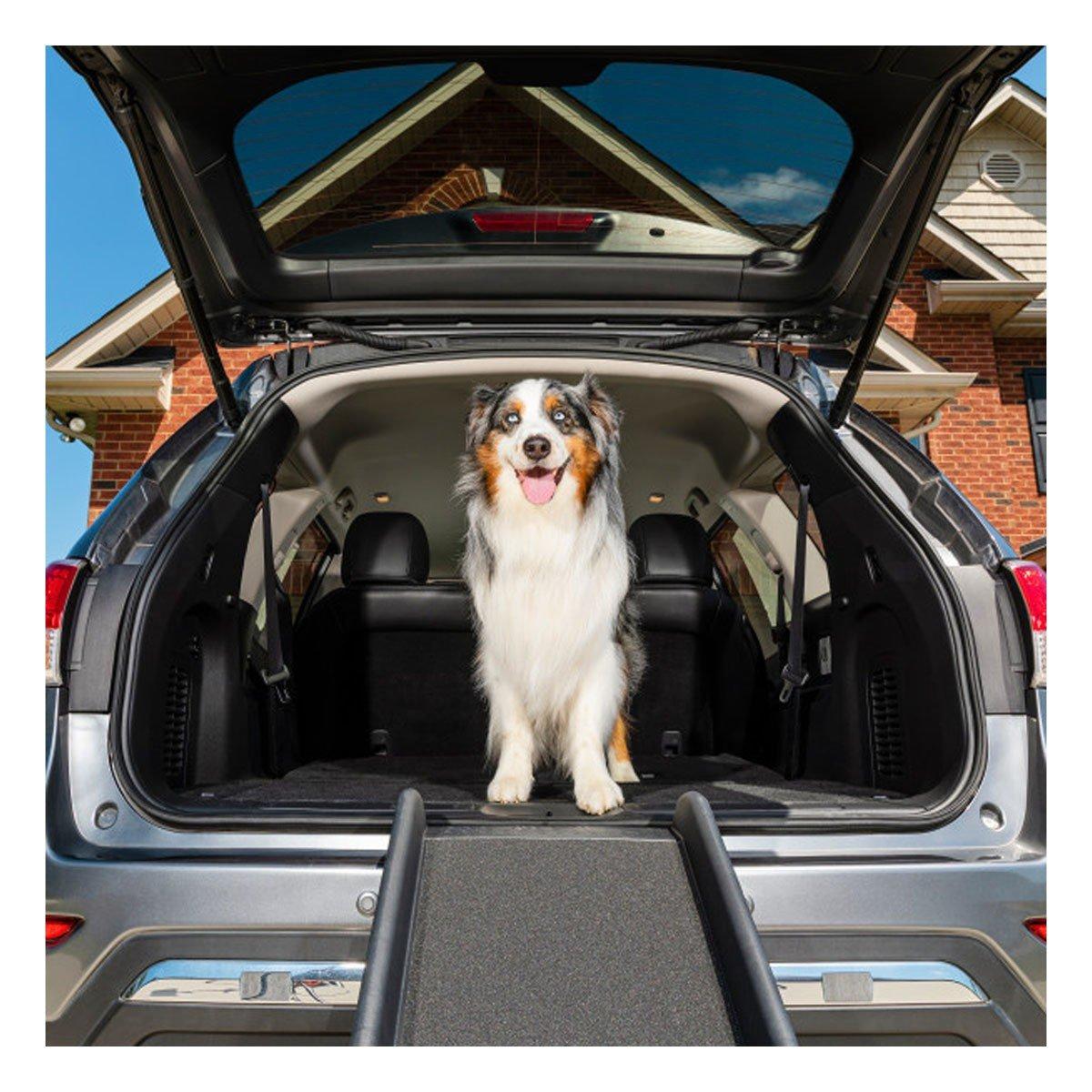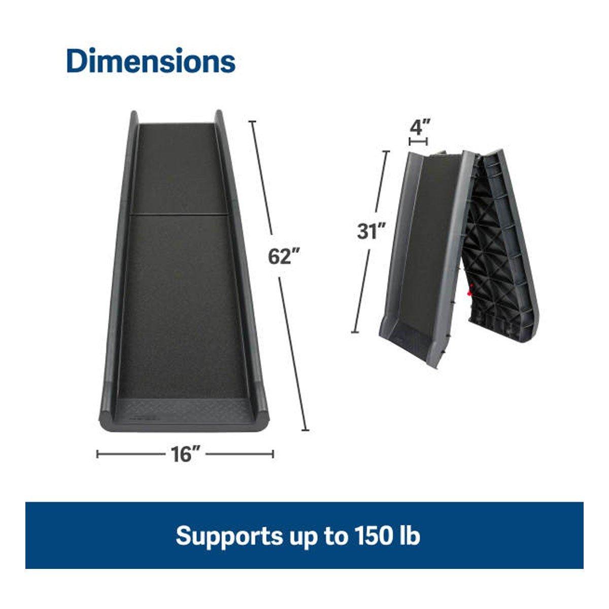 Give your best friend a leg up when you go on adventures together with the PetSafe Happy Ride Folding Dog Ramp. Weighing only 10 pounds, this ramp is easy for you to carry and lift in and out of your vehicle. Although light, the strong, durable folding ramp can support four-legged friends up to 150 pounds. If your dog isn’t quite tall enough to hop in the car, or if you want to help protect his joints, the folding ramp gives him the freedom to easily walk in and out of your car, minivan or SUV all by himself. The high-traction surface and side rails allow your dog to confidently walk up and down the ramp without slipping or falling. You can conveniently store your ramp by simply folding it in half and locking it with the safety latch while you are traveling in the car. PetSafe brand is here to help you and your pet live happy together™. Formerly Solvit™ brand - Packaging may vary.