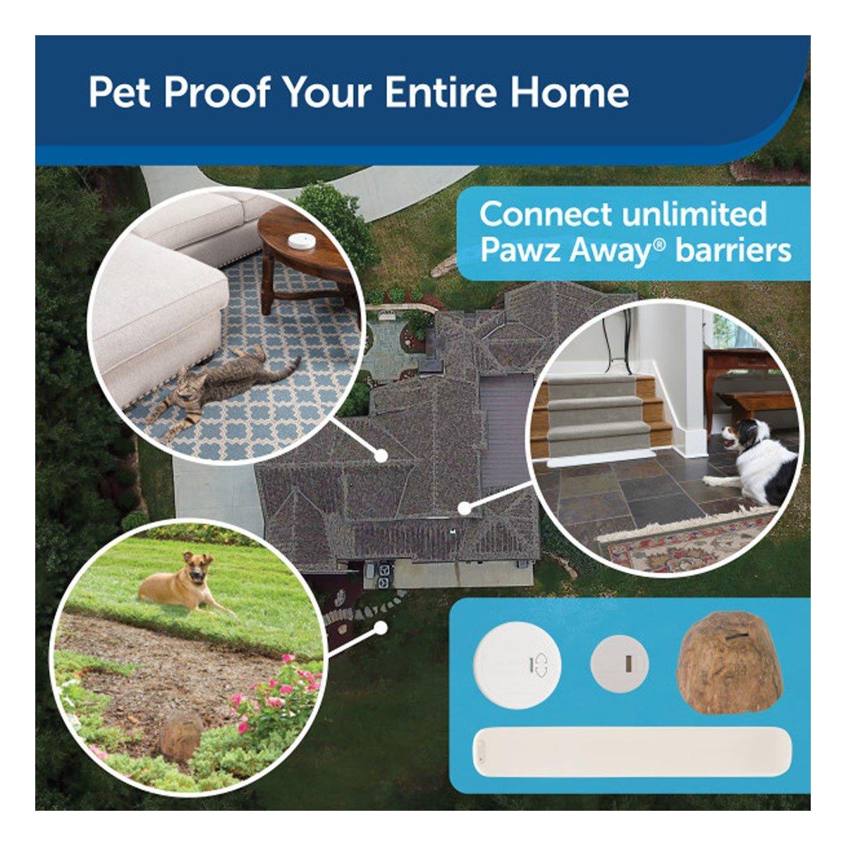 Expand your Pawz Away™ Outdoor Pet Barrier system with extra barriers to keep cats and dogs away from gardens, water features, pools and other places you want to them to avoid. You can protect and unlimited number of areas in your yard. This system gives you 2 setup options: The wireless setup protects a circular area up to 16 feet in diameter,or you can also create a custom-shaped barrier using up to 150 feet of boundary wire (sold separately). Cleverly designed to resemble a rock, the transmitter blends seamlessly into your landscaping and sends a safe static correction to your pet’s receiver collar when they enter a “no pet” zone. You can add an unlimited number of pets to the system if they’re wearing a PetSafe Pawz Away® Receiver Collar (additional collars sold separately). Trust PetSafe to help keep your pet healthy, safe and happy.
