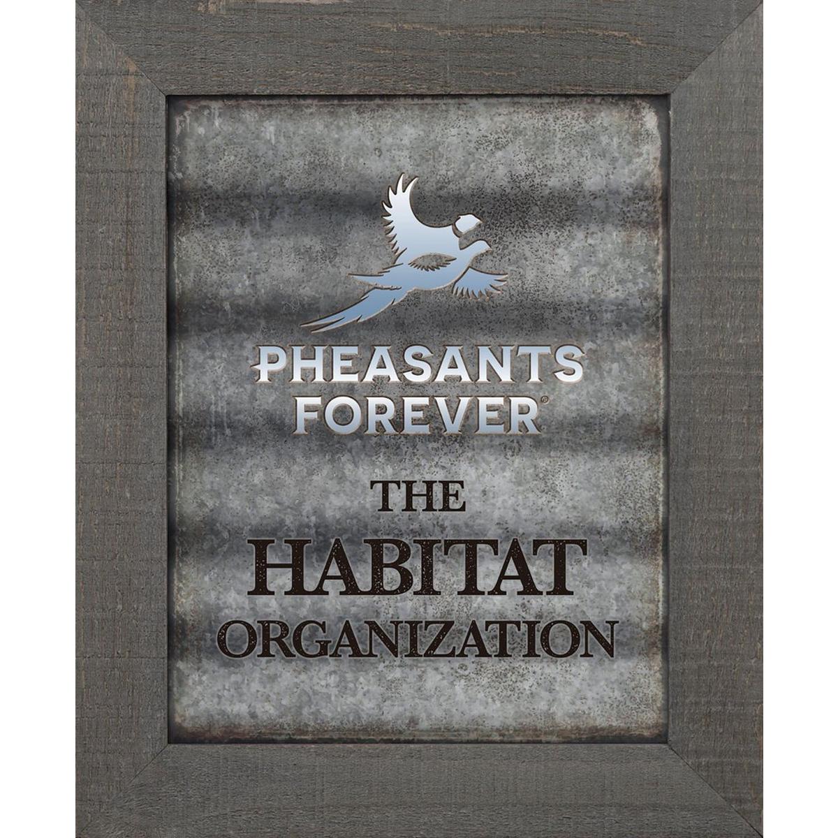 Pheasants Forever Framed Tin Sign 20"H x 16"W The perfect edition to any office, man cave, or she shed! Showcase your pride for the organization with rustic charm!