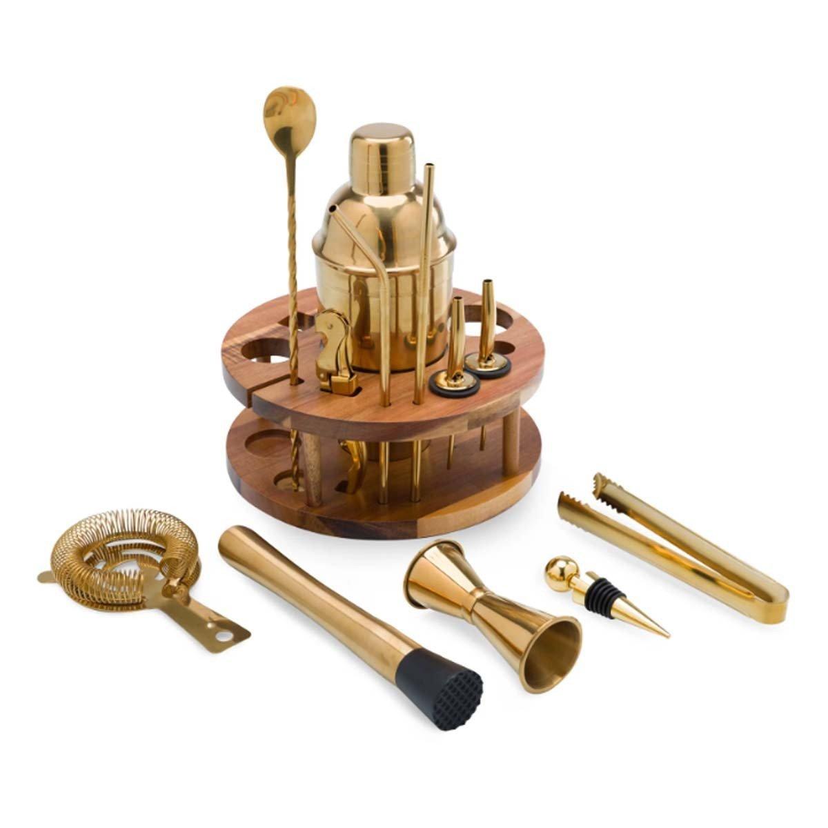 {"reviews":[],"offset":0,"limit":10,"total":0}"Full Description:\nBudding mixologist? Veteran cocktail-whisperer? Either way, your home bar is not complete until it includes the Carousel Lazy Susan Bar Set.\n\nFeatures:\n\u003cul>\n\u003cli>Lazy Susan tool holder made of acacia\u003c/li>\n\u003cli>Includes 12 gold plated tools: 1 Shaker, 1 Twisted Stem Cocktail Spoon with Hammer, 1 Corkscrew, 1 Straight Straw, 1 Bent Straw, 2 Liquor Pourers, 1 Stopper, 1 Double-Sided Jigger, 1 Hawthorne Strainer, 1 Tongs, 1 Muddler with Plastic Head\u003c/li>\n\u003c/ul>\n\nSpecifications:\n\u003cul>\n\u003cli>1 Bamboo Lazy Susan Bar Tool Holder (7.9" x 7.9" x 3.9"), 1 Shaker (3.25" D x 8.5" H, 19 oz.), 1 Twisted Stem Cocktail Spoon with Hammer (10"), 1 Corkscrew (4.9"), 1 Straight Straw (8.5"), 1 Bent Straw (10"), 2 Liquor Pourers (1.25" D x 4.5" H), 1 Stopper (3.5"), 1 Double-Sided Jigger (1.75" D x 3.5" H, 1 oz./2 oz.), 1 Hawthorne Strainer (5.5" x 3.25"), 1 Tongs (6.25"), 1 Muddler with Plastic Head (8") Care Instructions: Surface wash only with a damp cloth. To prevent wood from warping and cracking, do not submerge in water.\u003c/li>\n\u003cli>BUILT TO LAST Lifetime Guarantee\u003c/li>\n\u003c/ul>\n"