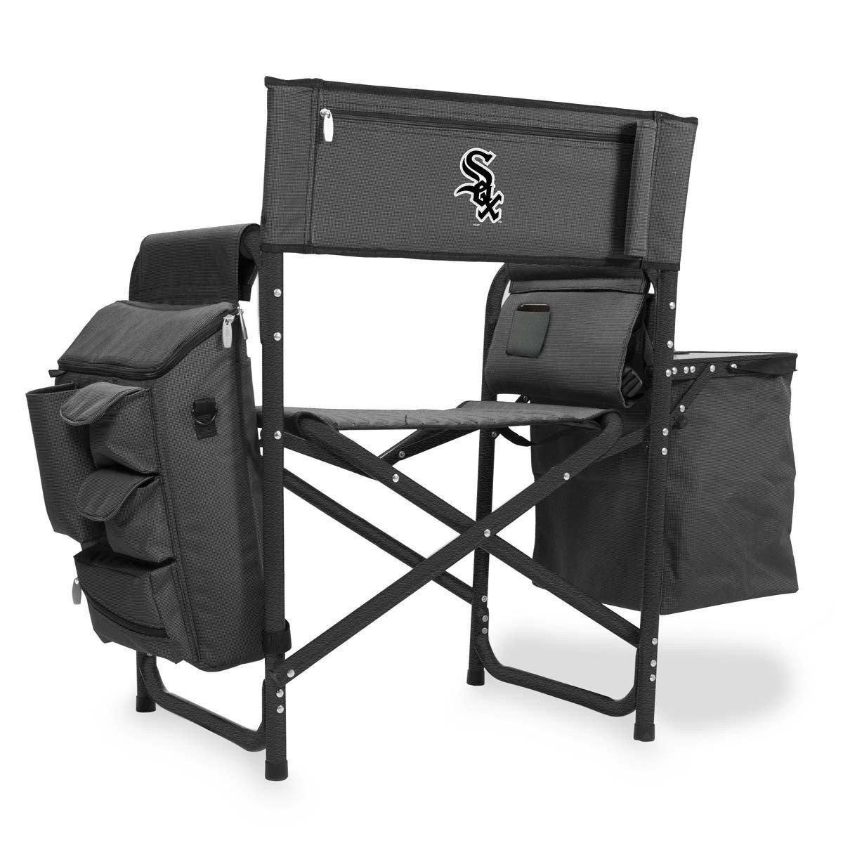 {"reviews":[],"offset":0,"limit":10,"total":0}"Full Description:\nPicnic Time Chicago White Sox Fusion Camping Chair\n\nFeatures:\n\u003cul>\n\u003cli>Folds flat for easy transportation and storage\u003c/li>\n\u003cli>350 lb. Maximum weight capacity\u003c/li>\n\u003cli>Durably constructed aluminum frame with a powder coated finish and low side bars to prevent chair sinking in the sand\u003c/li>\n\u003cli>Ribbed padding in seat and back rest for extra comfort\u003c/li>\n\u003cli>19.5" wide seat that sits 16.5" above ground\u003c/li>\n\u003cli>Molded cup holder in table tray with stability groove for cups with handles\u003c/li>\n\u003cli>Padded backpack strap system for secure and easy hands-free carrying\u003c/li>\n\u003cli>Pocket specially designed and located to hold a cell phone or portable music device\u003c/li>\n\u003cli>Folding tray table on side with two-tiered accordion-style, expandable fabric shelves that fold into underside of table when not in use\u003c/li>\n\u003cli>Molded cup holder in tray table\u003c/li>\n\u003cli>Fully-detachable, side-mounted 24+1-can insulated cooler with a multitude of storage pockets and adjustable shoulder strap so cooler can be used independent of the chair\u003c/li>\n\u003c/ul>\n\nSpecifications:\n\u003cul>\n\u003cli>Care Instructions: Surface wash with a damp cloth.\u003c/li>\n\u003cli>Includes: 1 Portable Folding Chair (19" x 24" x 33"), 1 Detachable Insulated Cooler (15" x 5.5" x 17.5"), 1 Detachable Armrest with Folding Backpack Strap System and Electronics Pocket (14.5" x 11")\u003c/li>\n\u003c/ul>\n"