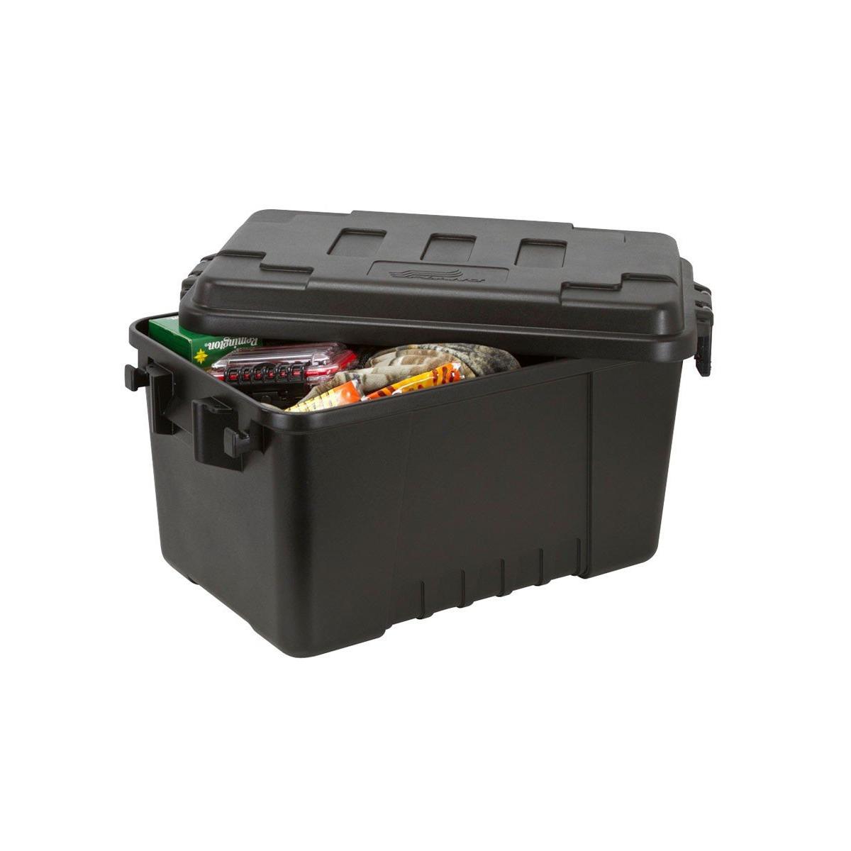Plano storage trunk features molded grooves on the top and bottom so that multiple units will "key" together as well as a reinforced removable lid and tie downs on the side. This small storage tub is also lockable.