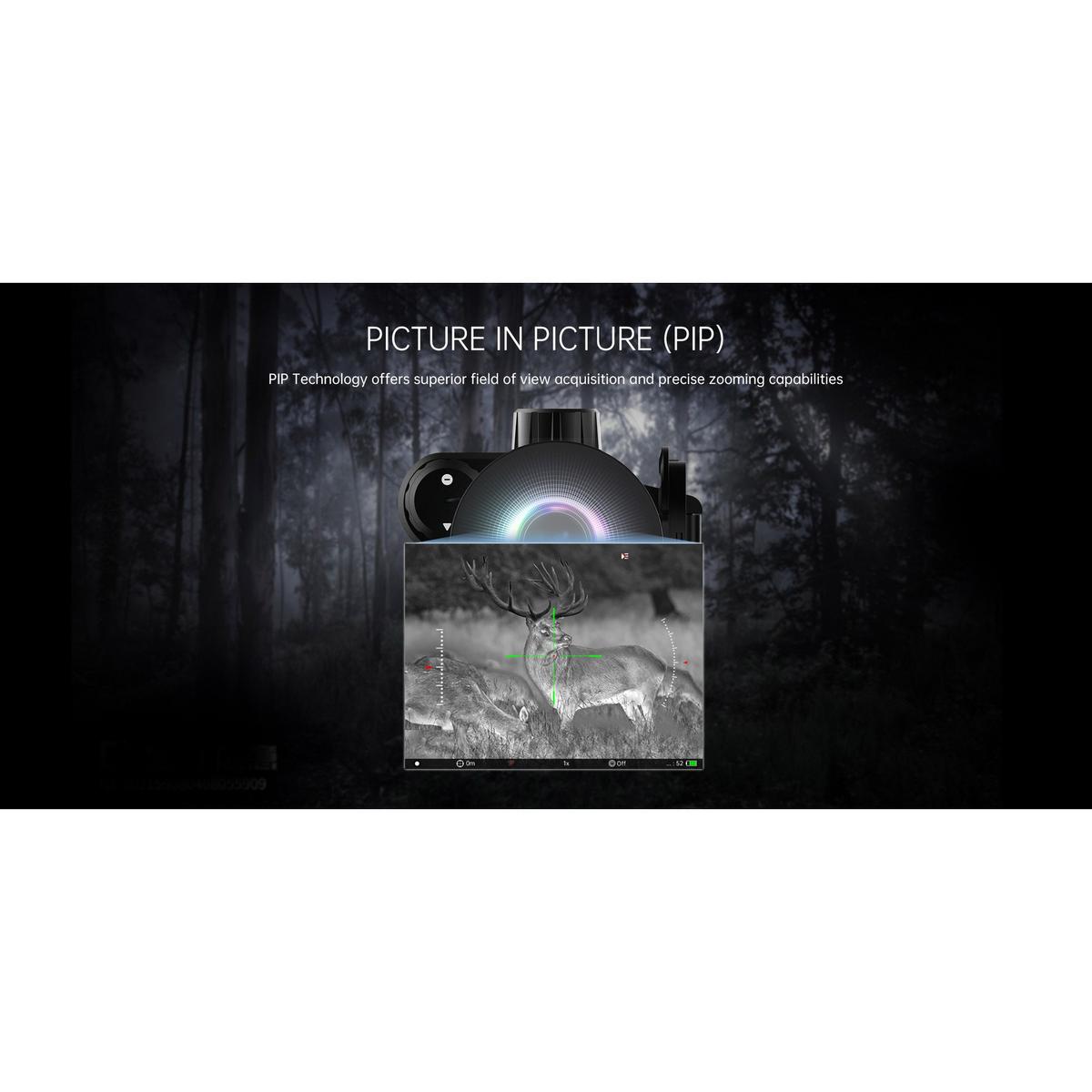With up to 5 hours of battery life on a set of 18650 batteries, the Harvester Thermal Riflescope provides hours of continuous use, allowing for quick battery swaps at a cost-effective price. A highly precise, ambidextrous top-located focus ring enables fast and precise focus adjustment, ensuring the highest picture quality display. Picture/picture mode and gyrostat add confidence to long-distance precision shot placement.