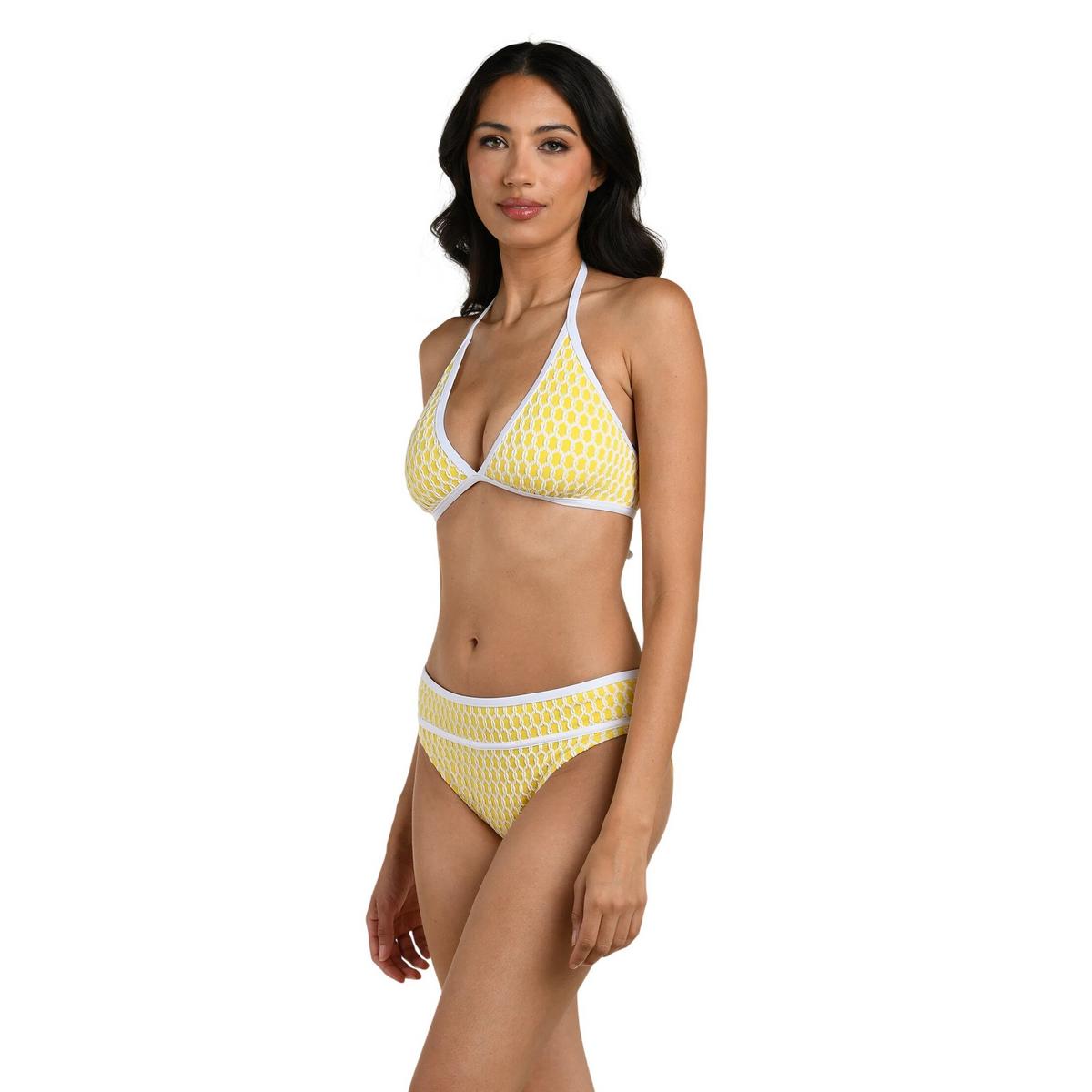 This Halter Top from the Prep & Paddle collection features a cheerful yellow-and-white geometric print featuring a repeating oval lattice pattern that feels modern, playful, and summery. It has a v-plunge neckline and halter straps that create a more angular shoulder silhouette, drawing the eyes upward while lengthening the arms.