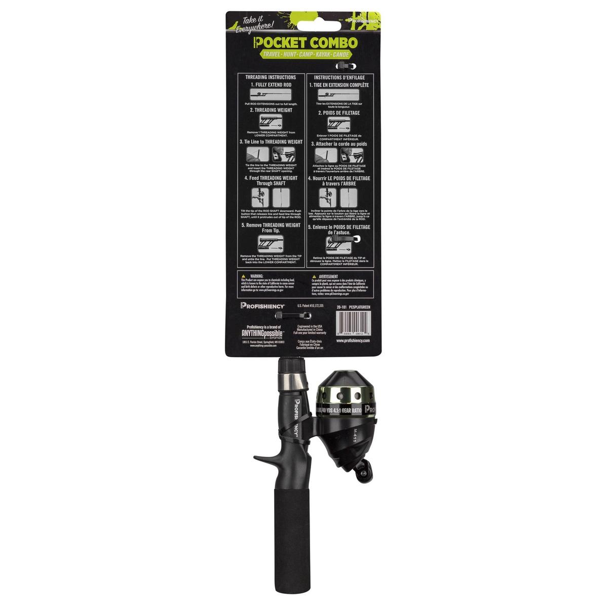 {"reviews":[],"offset":0,"limit":10,"total":0}"Full Description:\nThe ProFISHiency Micro Pocket Spincast Combo is the ultimate tangle free travel rod for those spontaneous fishing trips. The fiberglass rod extends to 30″ and can be retracted to 18″ to make storage easy, while the inline feed prevents the line from tangling. This Micro Pocket Combo can virtually be stored anywhere and is even perfect to use on your kayak or canoe.\n\nFeatures:\n\u003cul>\n\u003cli>Micro spincast reel\u003c/li>\n\u003cli>4.1:1 Gear Ratio\u003c/li>\n\u003cli>6lb Line\u003c/li>\n\u003cli>30″ Light Action Tangle-FREE Telescopic Fiberglass Rod\u003c/li>\n\u003c/ul>\n\n"