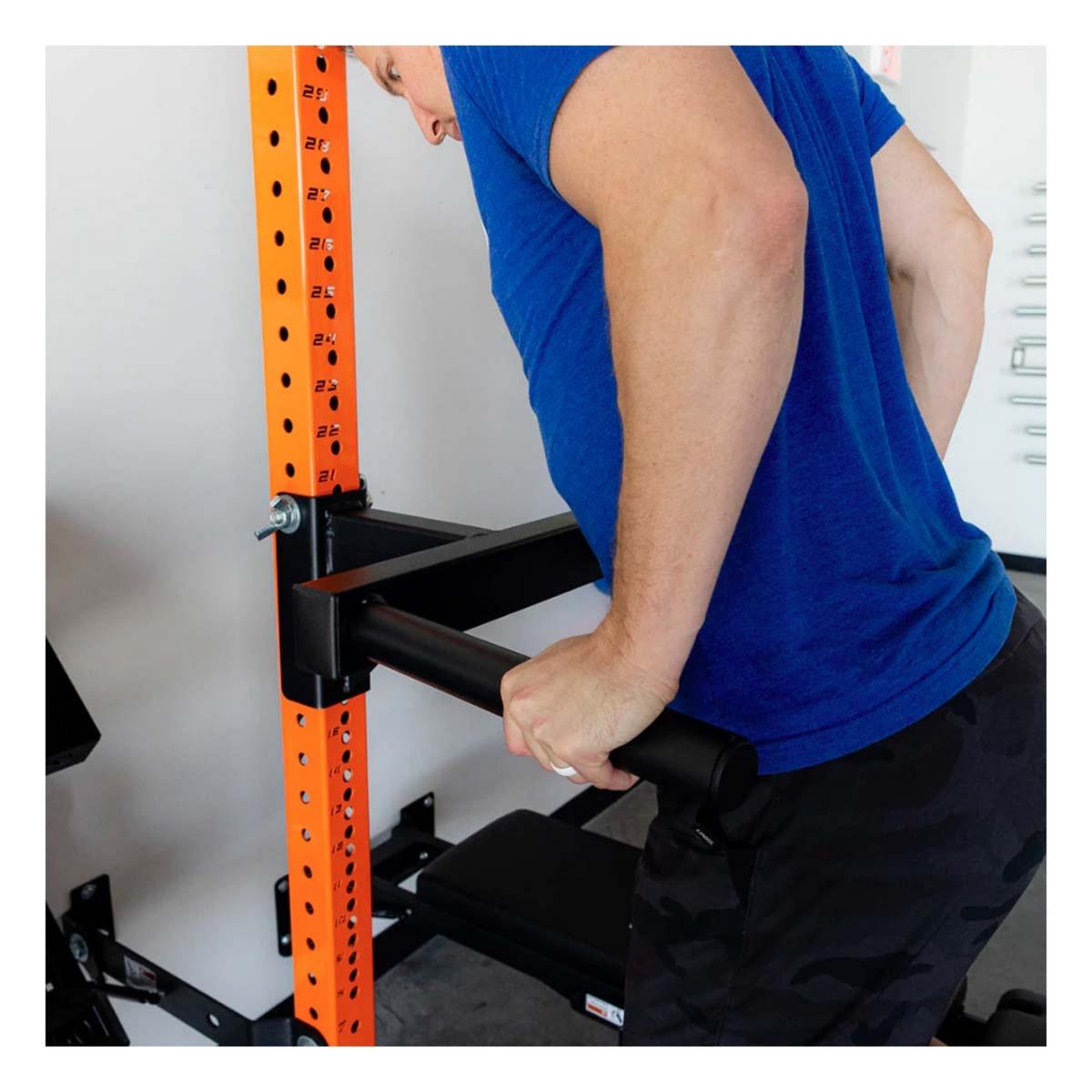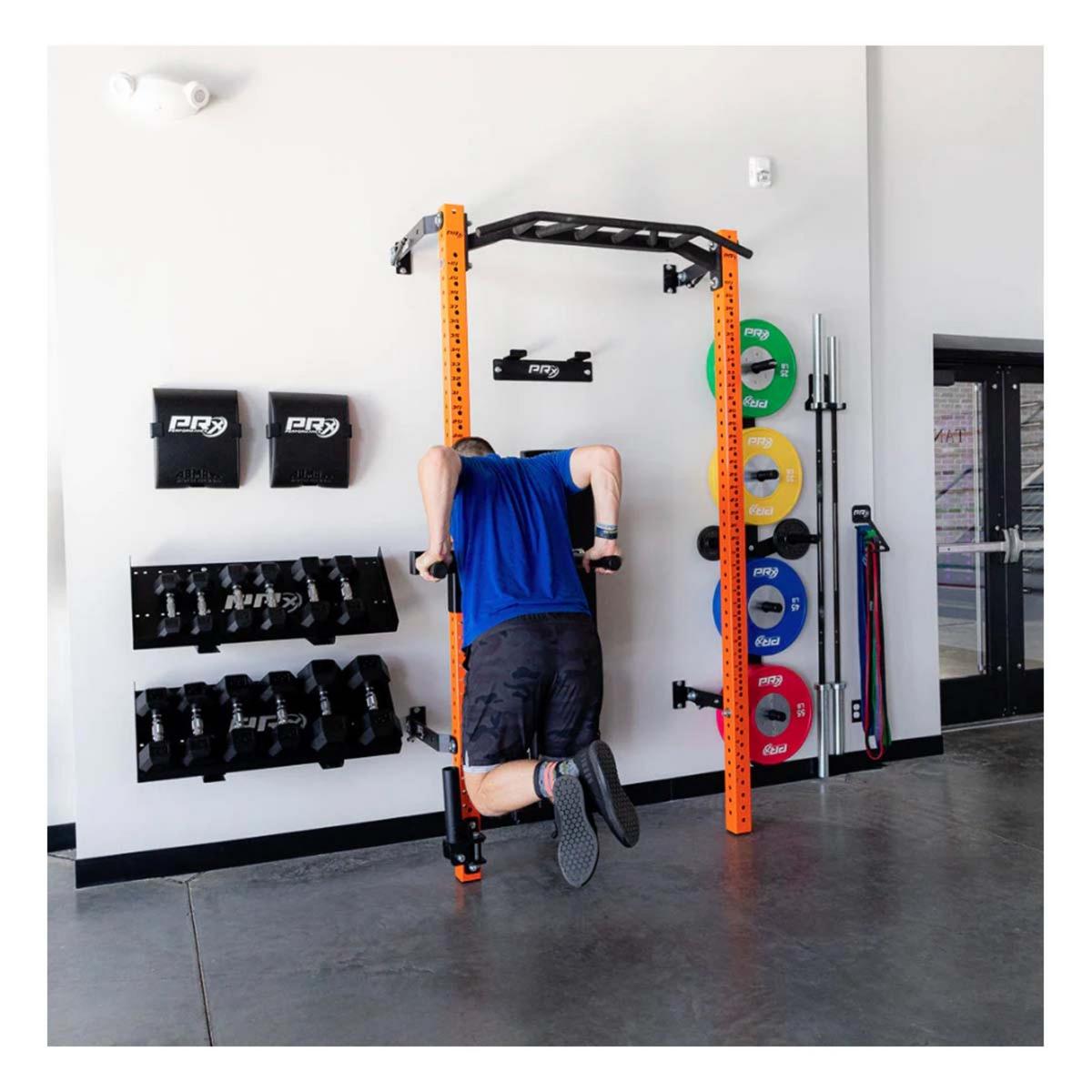 Our PRx 3x3 Dip Station easily attaches to the upright of any of our patented Profile® PRO folding racks or Build Limitless® Series . Store your dip station on the wall or Build Limitless® rack with our sleek storage solutions.