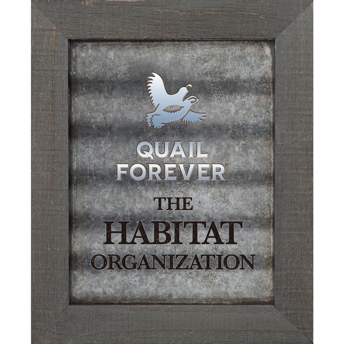 Quail Forever Framed Tin Sign 20"H x 16"W The perfect edition to any office, man cave, or she shed! Showcase your pride for the organization with rustic charm!
