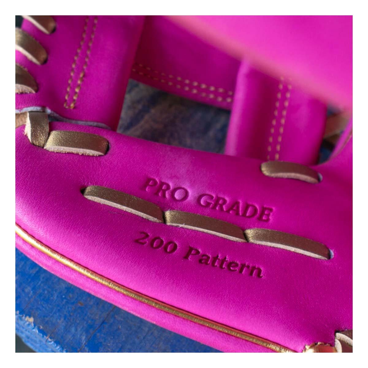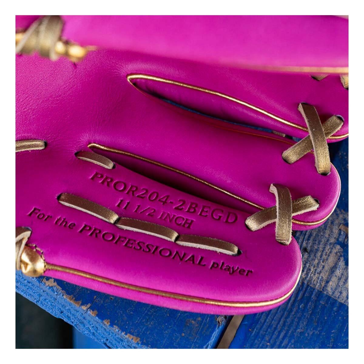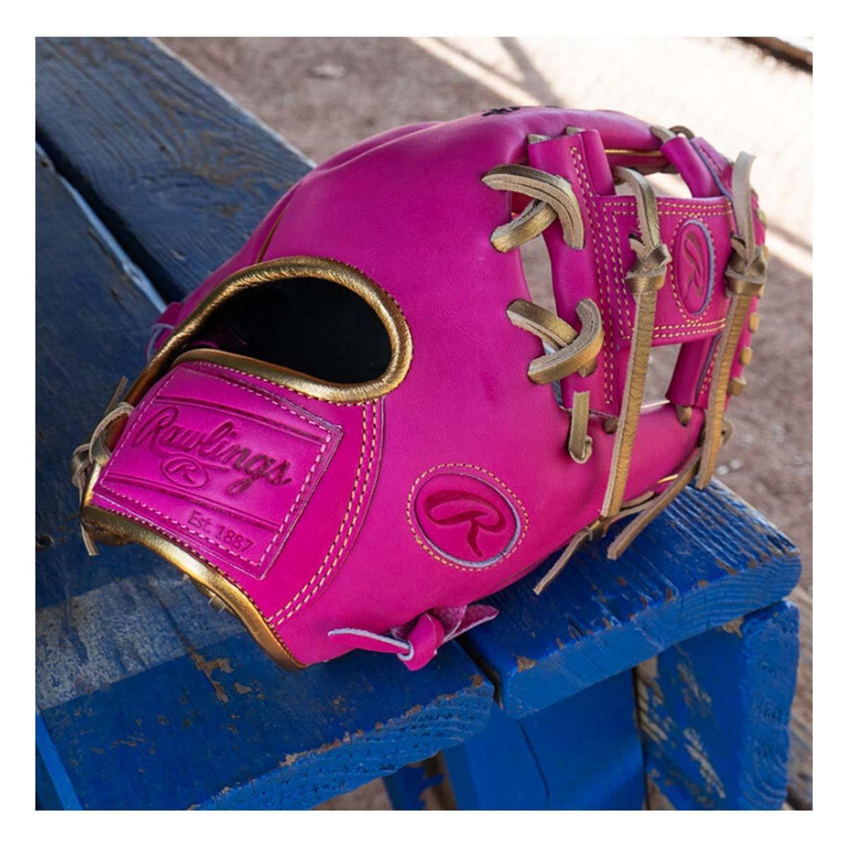Stand out on the field with this exclusive 11.5-inch Rawlings R2G Heart of the Hide berry pink glove. Its bold colorway is paired with luxurious, metallic gold accents — bound to turn heads as soon as you take the field.