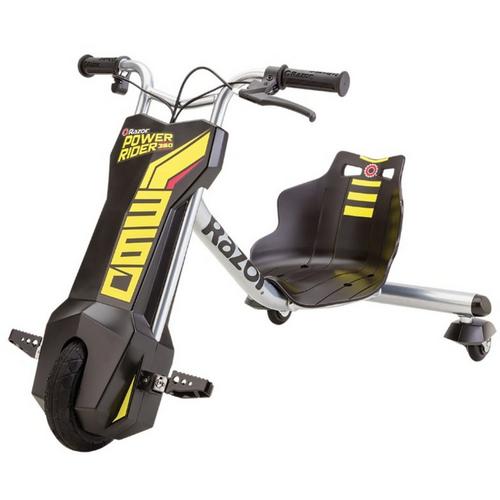 Ride into the future with the Razor PowerRider 360 electric tricycle that delivers performance with highly responsive back casters. With just the push of a button, you are off to the races and no pedaling is required. Race at speeds up to 9 mph(14 km/h), make full 360-degreespins slide and even drift on the high-performance, dual inclined rear caster wheels. It runs on a 12V battery, provides up to 30 minutes of ride time, and is designed with a hand-operated front brake for reliable stopping power.
