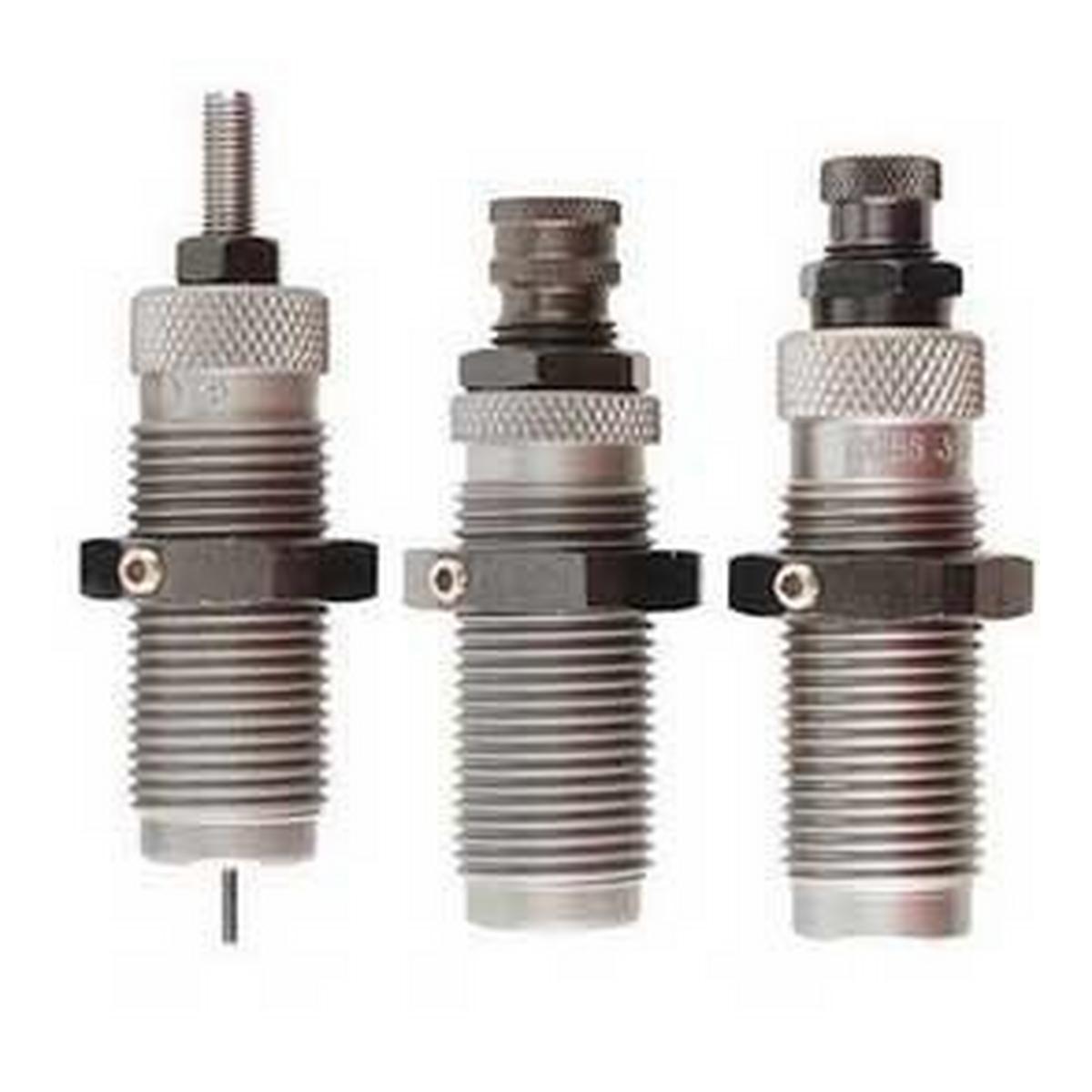 RCBS pioneered and developed 3-Die Sets for straight-wall rifle and pistol cases. The Carbide Sizer Die sizes the case and de-primes (the carbide sizer ring eliminates the need to lubricate). The Expander Die expands the case to the proper diameter to accept the bullet, and it imparts case mouth flare/bell for bullet feeding. The Seater Die seats the bullet and roll crimps.