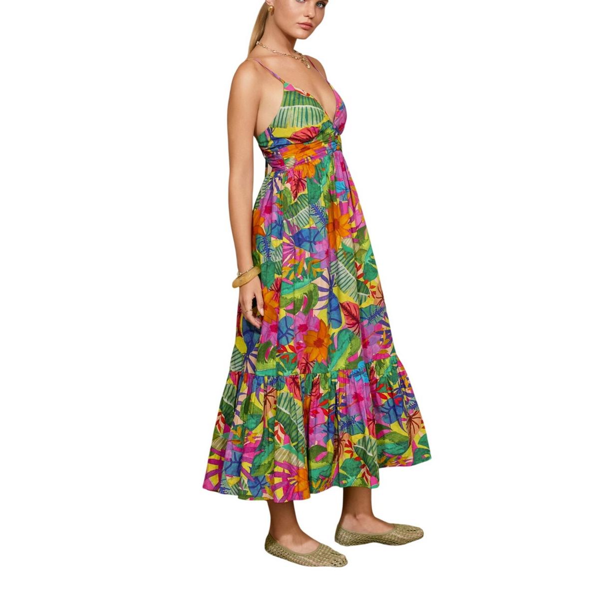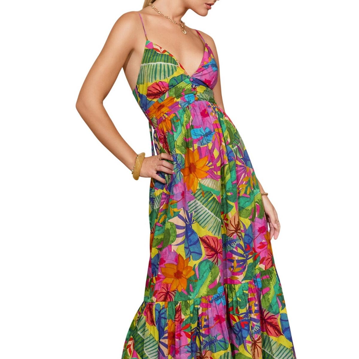 Tropical print maxi dress with a flowy tiered A line skirt. Model is 5'9" and wearing size Small.