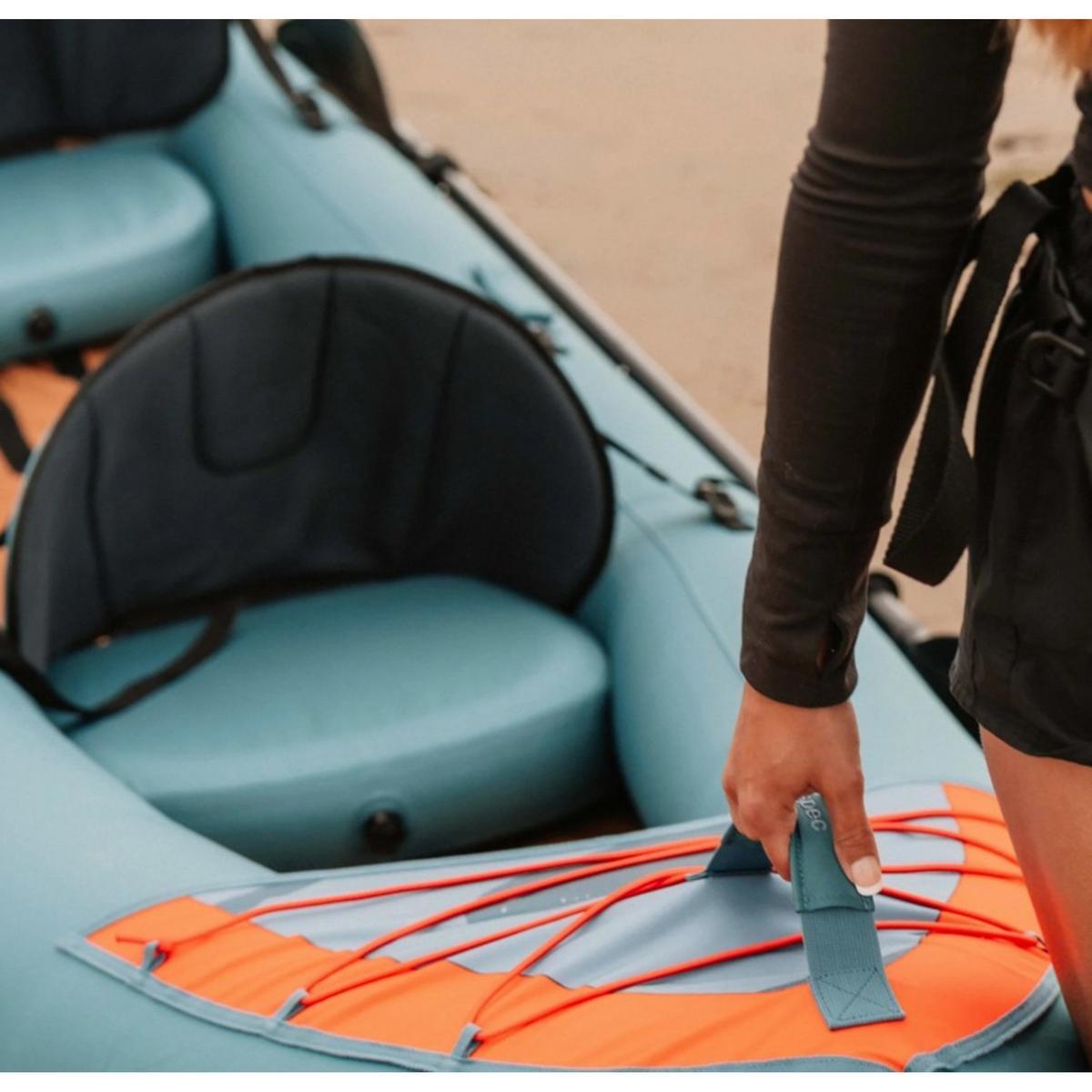 Embark on endless adventures with our most durable, portable, and spacious 2-person kayak. Coaster’s heavy-duty shell and a puncture-resistant tarpaulin hull make it durable and stable, even when things get a bit choppy. Unlike most, this tandem kayak is extra roomy, so you can bring along an adventurous pup or kid. (2 seats and paddles included; ensure everyone is wearing a life vest.) Front and rear bungee nets offer ample storage space for all the gear you bring aboard and dual paddle holders are by your side whenever you want to put down your paddles and coast. Fine-tune your kayak’s setup with 2 adjustable seats and 1 removable footrest included: you can customize how much legroom each passenger has and keep your feet braced for an extra comfortable kayaking experience.
