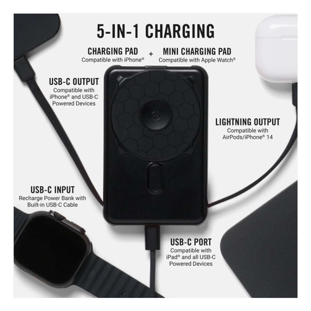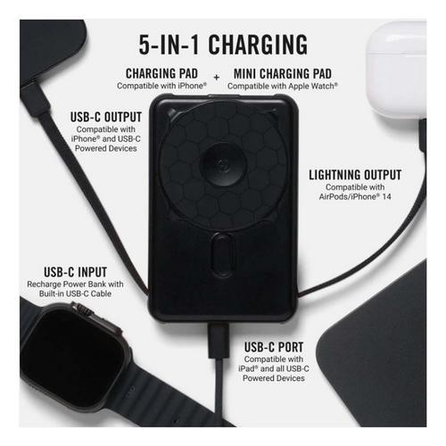 The Ridge Magnetic Power Bank bridges old and new, delivering 5-in-1 power solutions through integrated cables and magnetic attachment. No more tangled cords or compatibility issues. Just 10,000mAh of intelligent power that works with your latest MagSafe devices (like your iPhone and your Apple Watch) while maintaining backwards compatibility through built-in Lightning and USB-C connections.