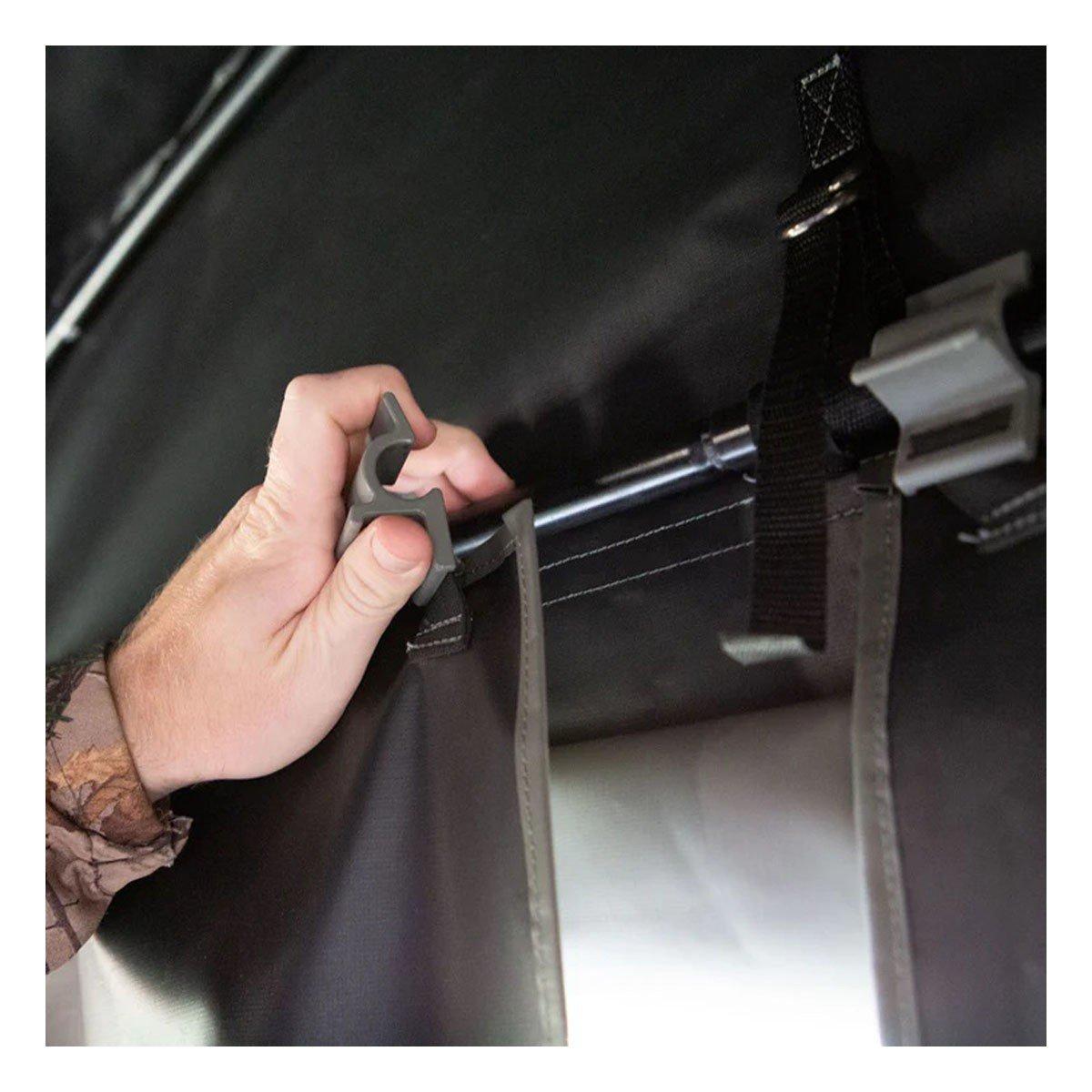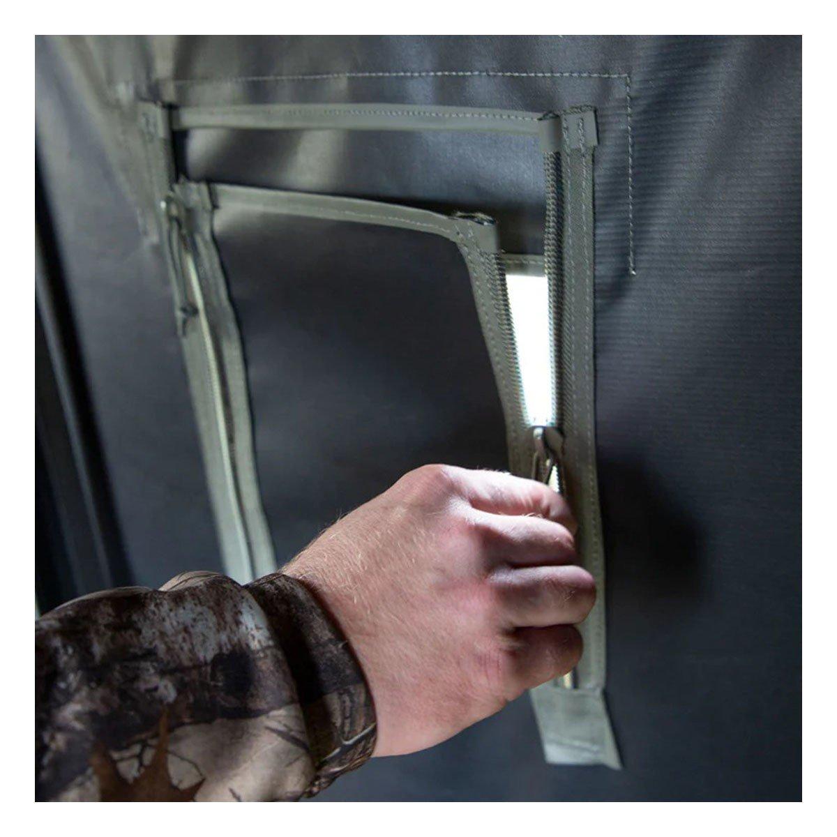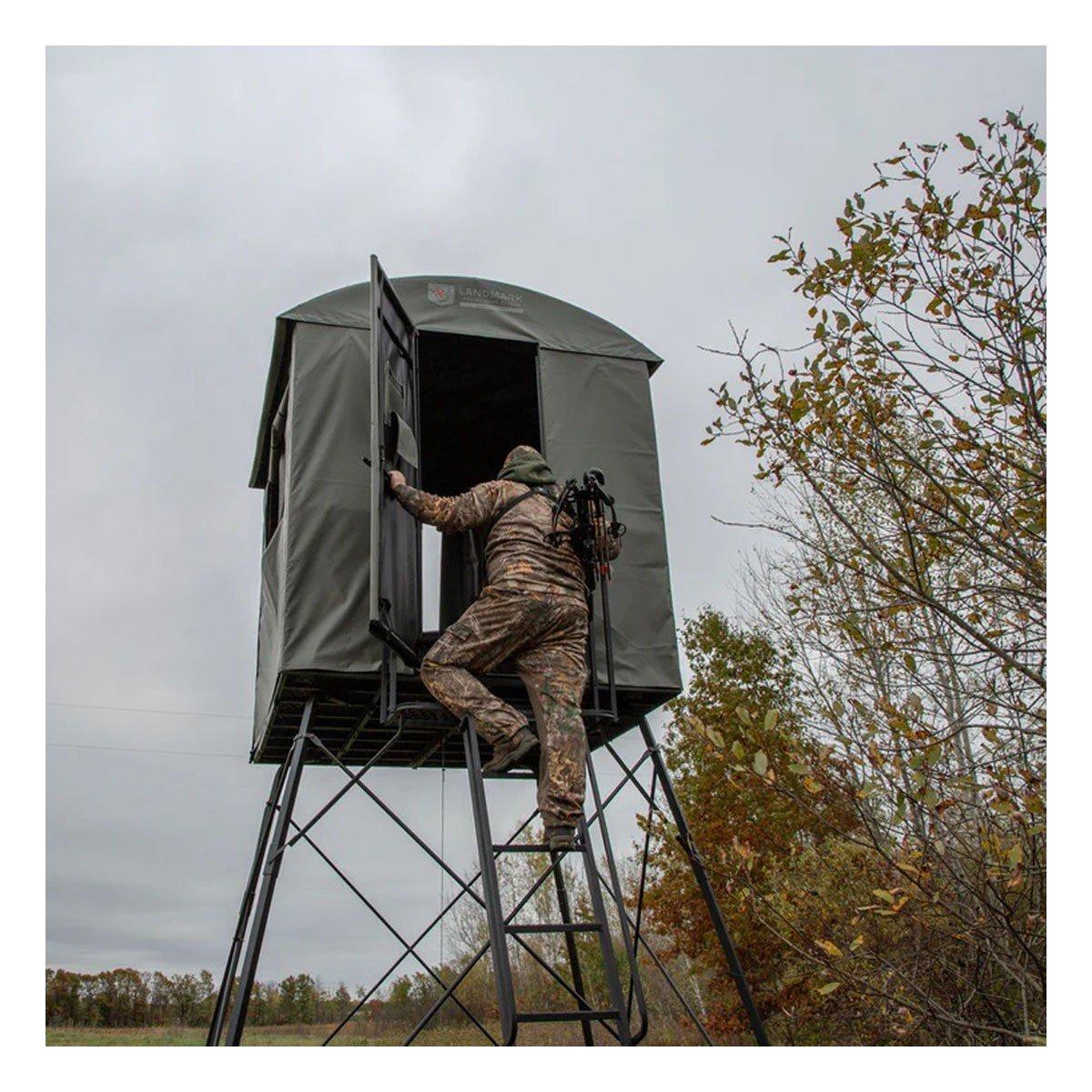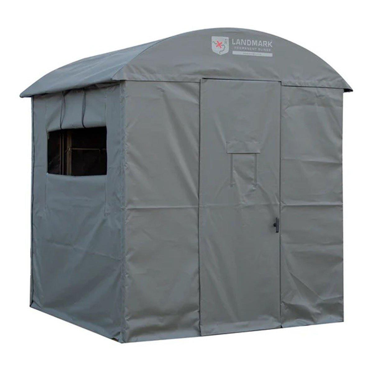 Portable ground blinds take a beating from the sun, wind, rain, and snow. Colors fade, materials rot, poles break and fabric tears. The Landmark™ 600 Permanent Blind was designed and constructed to resist the elements year after year. The durable steel frame is covered with marine-grade reinforced synthetic tarpaulin, made from the same rugged materials used in pick-up truck tonneau covers. The adjustable horizontal windows and clip-on vertical panels allow for custom openings during your hunt. The hinged door provides plenty of space for easy entry and exit whether on the ground or using the Landmark 600 10’ Tower. If you’re looking for an affordable year-round hunting blind with enough room for group hunts and archers, the Landmark™ Permanent Blind is for you.