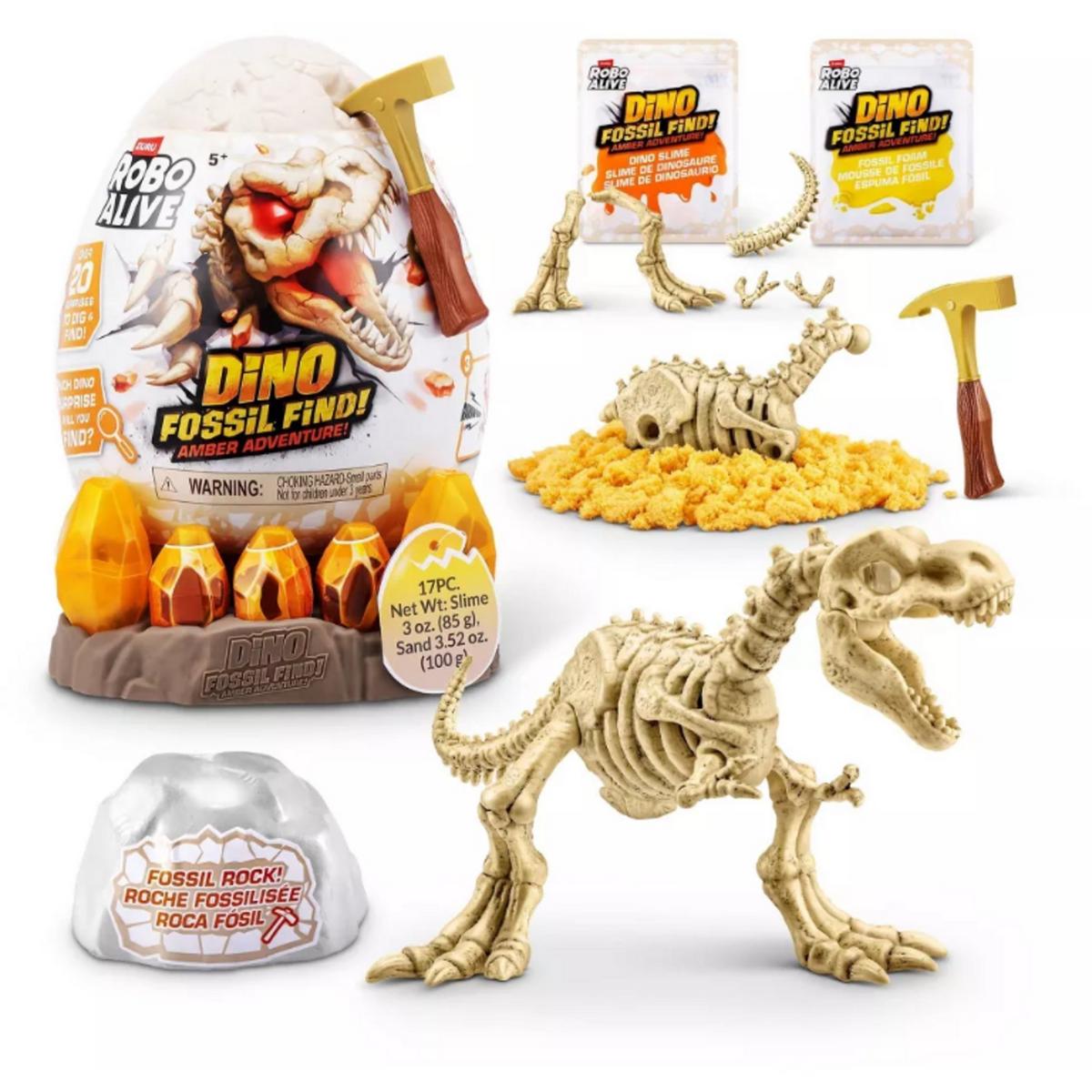 Calling all young explorers! Dive into the thrilling world of Robo Alive Fossil Find Amber Adventure. Dig through layers of rock, sand, and glow-in-the-dark magma slime to uncover hidden dinosaur fossils and enchanting amber eggs. Assemble the fossils to bring your dinosaur to life with light-up eyes! With four unique dinosaurs to discover, this interactive adventure delivers the excitement of excavation, collection, and assembly—perfect for curious minds and aspiring paleontologists.