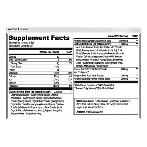 Loaded Greens is an all-in-one daily health and wellness superfoods powder. Through the inclusion of Greens Balance and BettaBerries, Loaded Greens provides essential micronutrients, antioxidants, and vitamins to support natural energy and a healthy immune system. This superfood powerhouse also supports proper digestion and gut health with Sukre fiber. Furthermore, RYSE Loaded Greens contains zero artificial colors, flavors, or sweeteners while providing best-in-class taste!