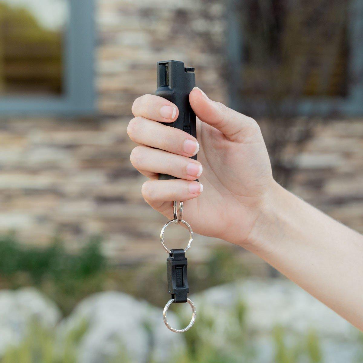 - Easily Accessible Quick Release Key Ring provides access to spray when keys are in ignition or lock while the locking top safety helps prevent accidental discharge; finger grip enhances aim and product retention