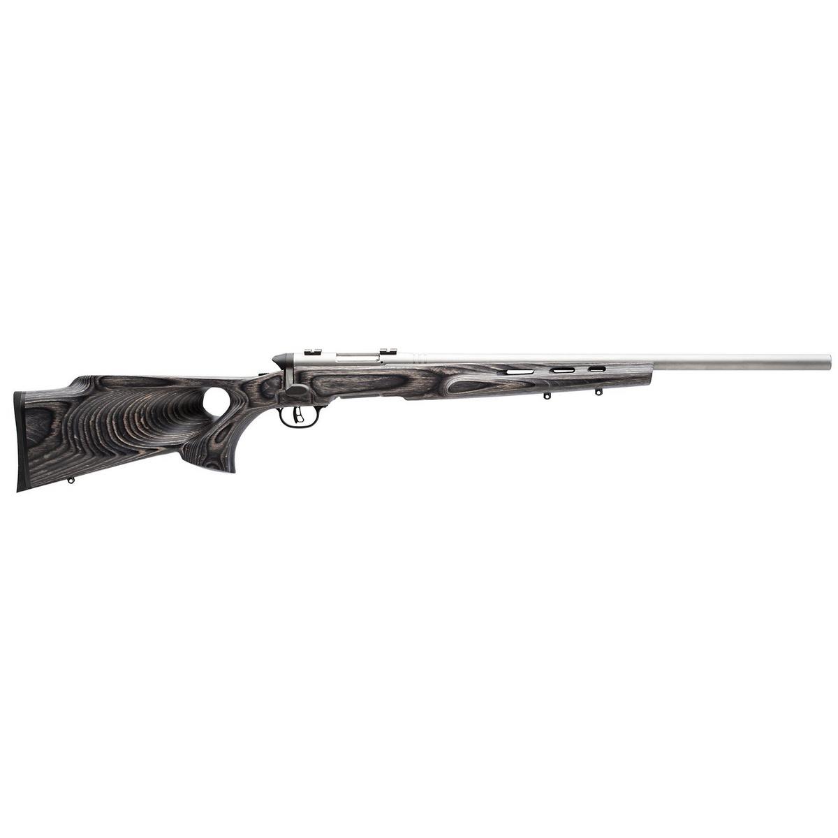 The Savage Arms B Mag Target 17 WSM Rifle is engineered to optimize the performance of the .17 Winchester Super Magnum rimfire rifle cartridge. This bolt-action rifle uses rear-locking lugs and a cock-on-close bolt to deliver a fast action with a smooth feel. The barrel on this rimfire rifle features precision-rifling for maximum accuracy and balances perfectly with the wood-laminate stock for improved handling. Zero-tolerance headspace control sets the headspace to its minimum for a more solid lockup and more consistently powerful and precise shots. This Savage Arms rifle is built with an adjustable AccuTriggerTM that allows each shooter to adjust the pull weight between two and five pounds to provide the optimal feel and a crisp, personalized trigger pull. The gray thumbhole stock offers a sleek look and a contoured rubber butt pad delivers more comfortable shouldering. With a smooth-feeding eight-round rotary magazine, the Savage Arms B Mag Target 17 WSM Rifle provides a reliable shooting experience perfect for casual target shooting and plinking.