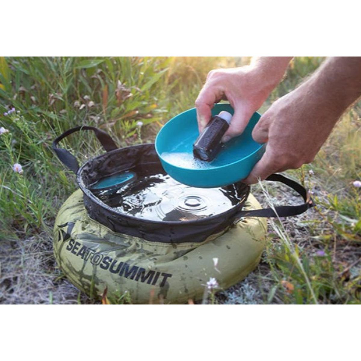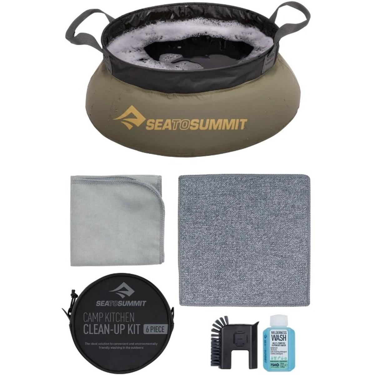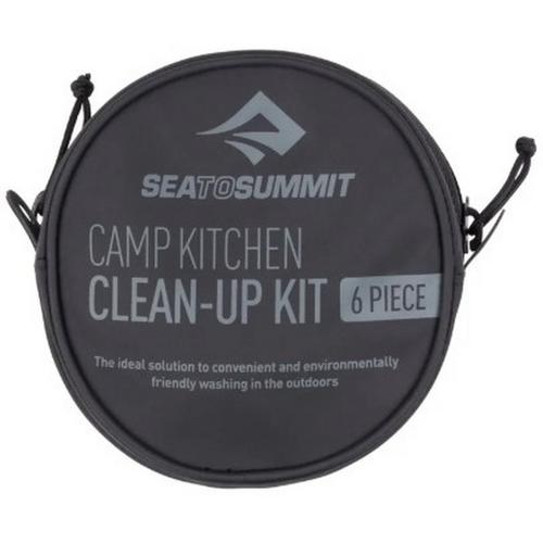 Clever, compact, all-in-one Camp Kitchen Clean Up Kit makes camping dish duty easy. Includes a 10L sink with broad base and stiffened rim for stability. Kit features a compact pot scrubber with scraper, dual-sided washcloth, quick-drying DryLite towel, and a refillable bottle of concentrated biodegradable Wilderness Wash. Designed to adhere to Leave No Trace Seven Principles - use tools 100m from waterways to minimize impact. Lightweight, efficient, and complete for any camping cleanup.