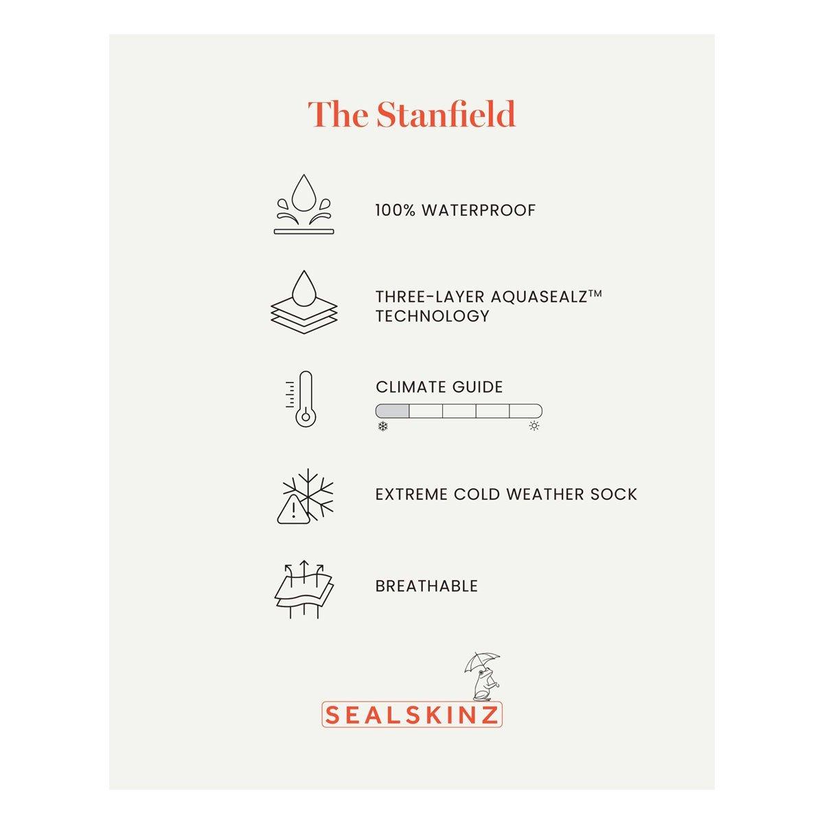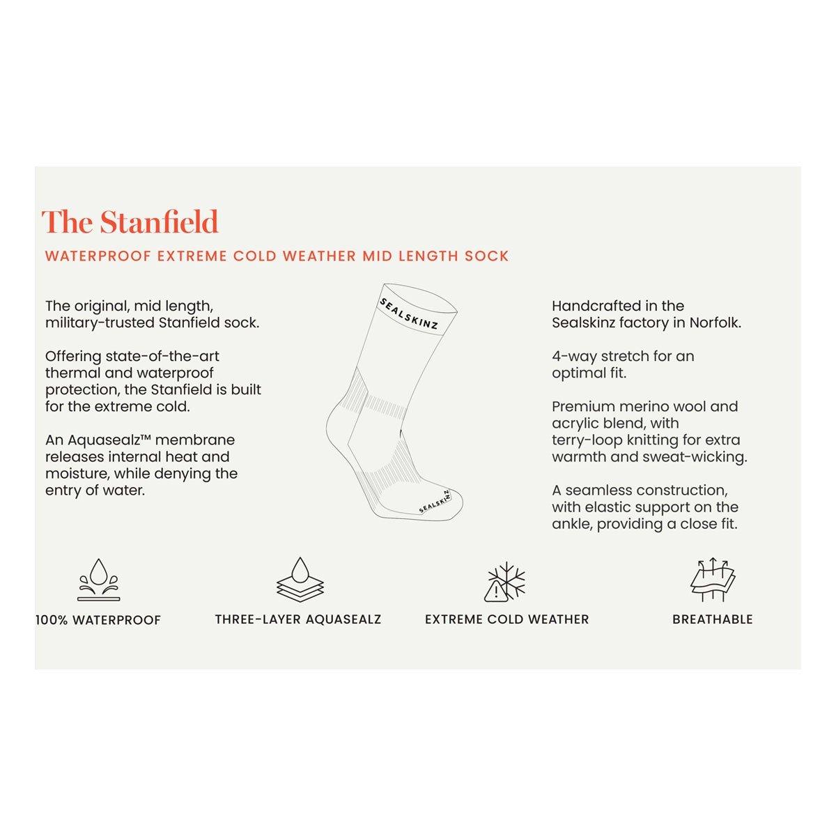 The original, mid length, military-trusted Stanfield sock. Offering state-of-the-art thermal and waterproof protection, the Stanfield is built for the extreme cold. An Aquasealz™ membrane releases internal heat and moisture, while denying the entry of water. Handcrafted in the Sealskinz factory in King’s Lynn, Norfolk.