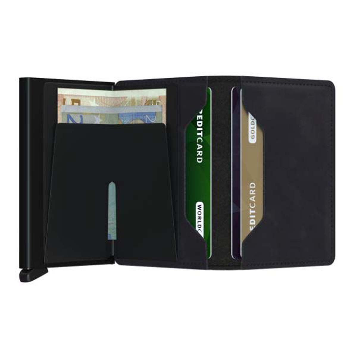 The patented mechanism allows you to slide out your cards with one simple motion, ready for immediate use. The aluminium protects from bending, breaking and unwanted wireless communication.