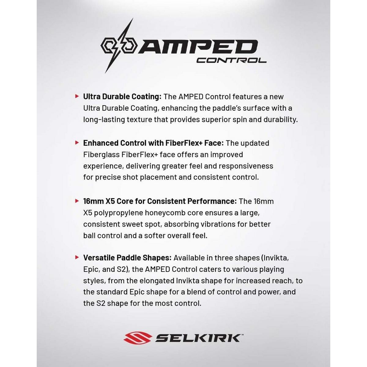 Now, Selkirk is excited to introduce the AMPED Control, a paddle designed to evolve your game. This new iteration features a next-generation Ultra Durable surface coating, that provides long lasting spin, while maintaining the classic AMPED feel that players know and love. The new Ultra Durable coating is the result of hundreds of evolutions and iterations in our R&D process creating a paddle that now delivers longer lasting spin.