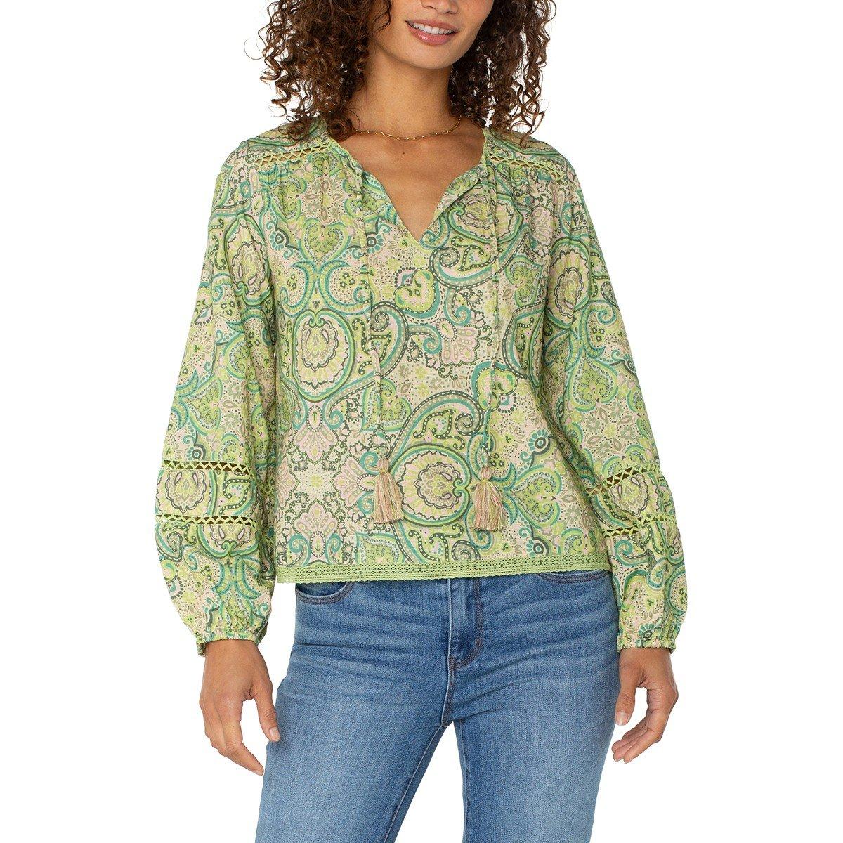 Women's Liverpool Los Angeles Shirred Woven Long Sleeve Notch Neck Blouse