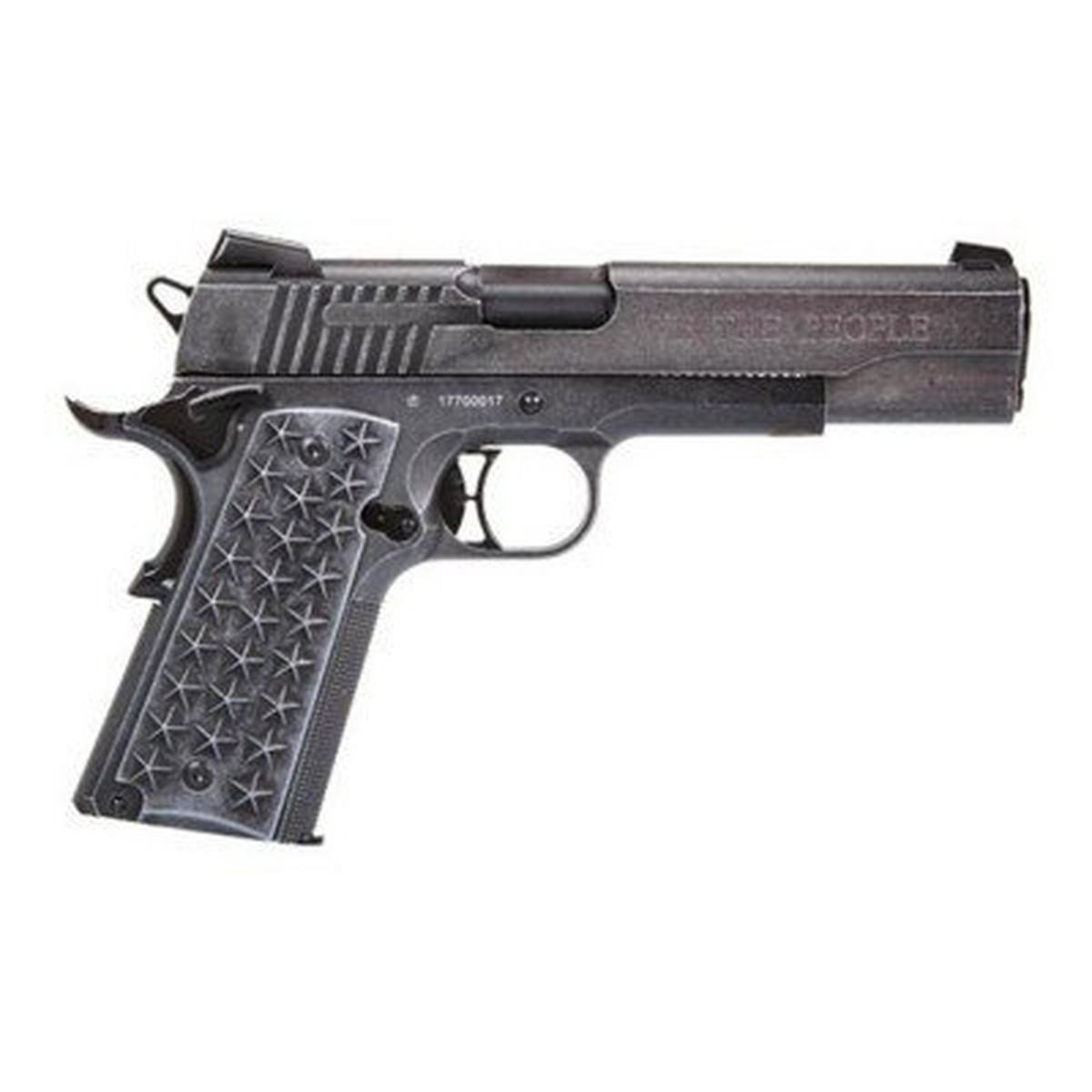 Modeled after the exceptionally popular 1911 We The People full-size centerfire pistol, which is inspired by a rich, patriotic history, the BB pistol version of this uniquely-American handgun features the same custom grips adorned with 50 stars (25 per side) that represent each state of the Union. A distressed finish on the stainless-steel slide and frame includes patriotic engravings, such as 13 stars atop the slide and "We The People" and "1776" on the slide flats.