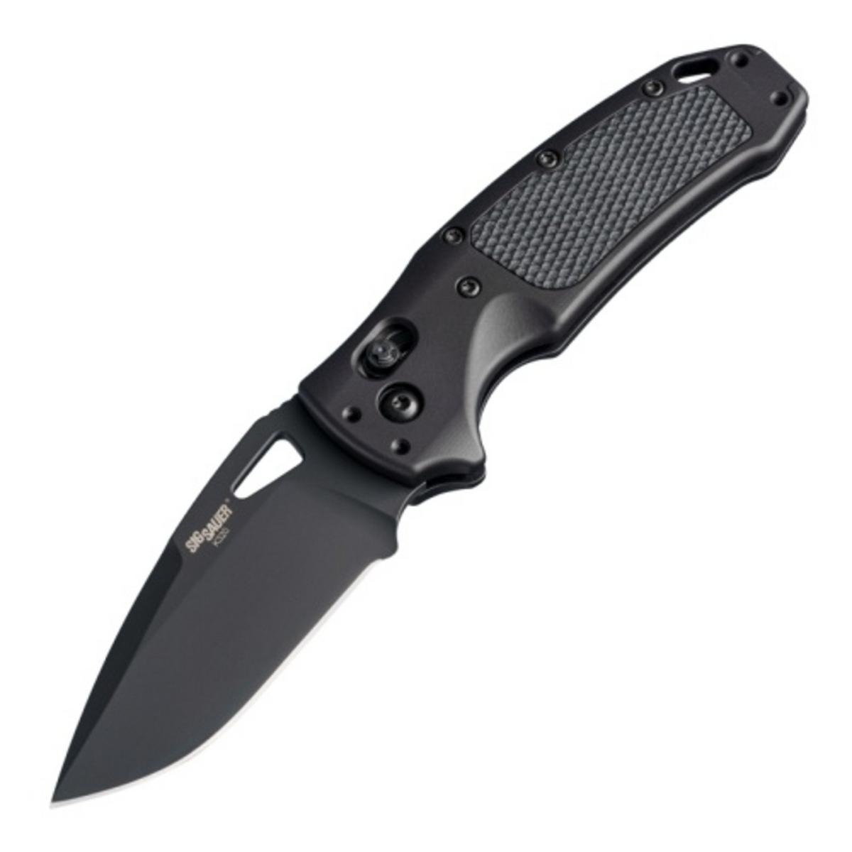 The Hogue SIG K320 AXG PRO is a folding knife featuring a 3.5" drop-point blade crafted from CPM-S30V steel with a black Cerakote finish for durability. Its black handle with solid G10 inserts and reverse checkered texture provides a secure, ergonomic grip, and the knife uses Hogue’s ABLE Lock for smooth, safe one-handed operation. Compact and reliable, the K320 AXG PRO is ideal for everyday carry and tactical use.