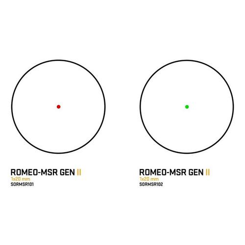 Available in either a green or red reticle, the ROMEO-MSR GEN II maintains adaptability with an analog rotary illumination dial to manipulate 12 individual brightness settings, including two dedicated night vision options. Featuring a redesigned see-through riser mount, the ROMEO-MSR GEN II allows for a convenient co-witness while still maintaining ultimate durability.