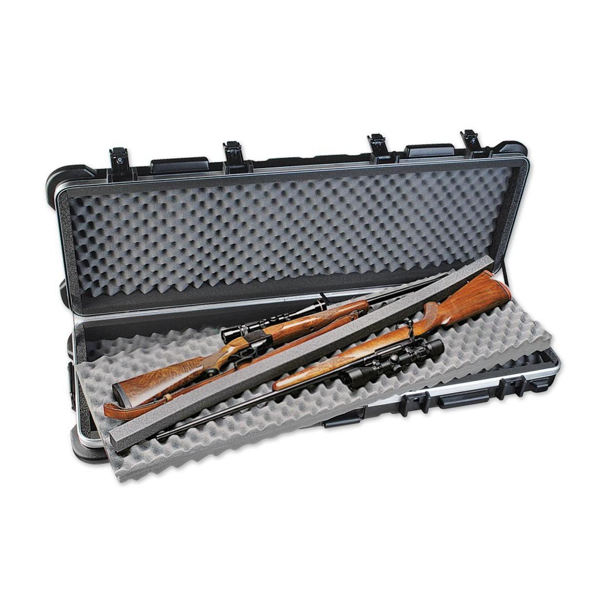 Capable of accommodating four rifles or two rifles and a bow with SKB's trademarked "bunk-bed" padding and divider protection system the 2SKB-5014 features SKB's unique Perfect Match Valance Bending System for a perfect seal. Weather resistant stackable patented fiberglass and nylon trigger release latches with two locking latches bumper protected hardware built-in wheels and both carry and tow handles for easy transport all come standard.