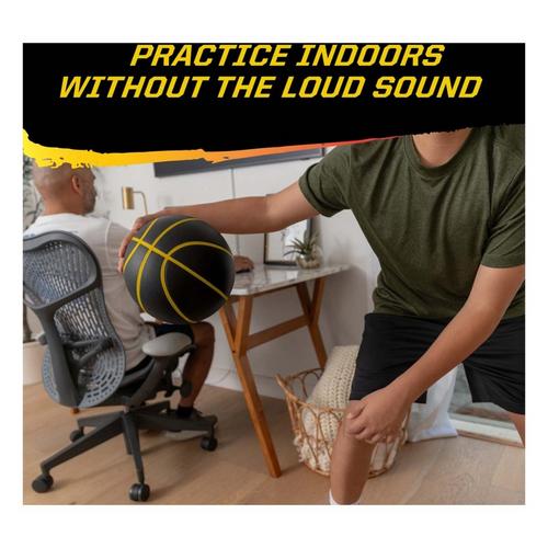 Dribble indoors without the noise! The Bashhhketball Pro is a silent basketball, engineered to deliver an authentic basketball training experience in a quiet, indoor-friendly design. Unlike traditional basketballs, its polyurethane foam exterior provides a softer impact, reducing noise while still allowing you to train effectively. Dribble on wood, tile, and carpet without sacrificing performance, so you can practice wherever you have space. This ball is designed to replicate game-day conditions. At 29.5” and 590g (22 oz), it is the only official-size, official-weight foam silent basketball available, giving players the confidence that every rep indoors will carry over to the court. The dual-density polyurethane foam blend produces the same bounce height as a real basketball while resisting wear and maintaining its shape through repeated use. For enhanced handling, the Bashhhketball Pro features integrated channels and grooves, simulating the feel of a standard basketball for precise ball control and to learn consistent hand placement. Whether refining crossovers, between-the-legs, or behind-the-back movements, this ball supports effective skill-building. With its quiet exterior, authentic weight, realistic bounce, durable build, and improved grip, the Bashhhketball Pro stands as the most complete training tool for basketball players practicing indoors.