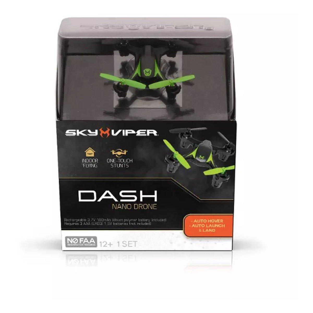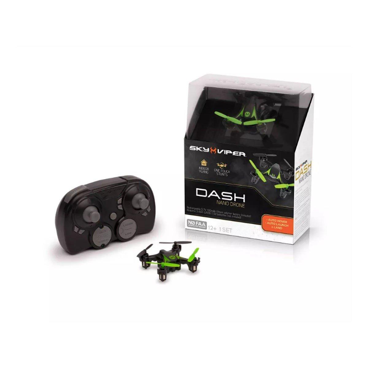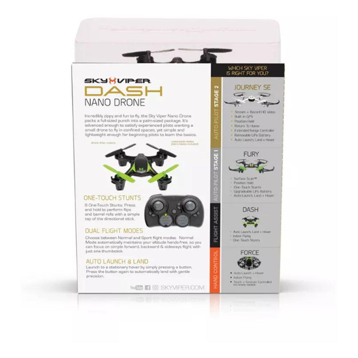 Incredibly zippy and fun to fly, the Sky Viper Dash packs full-size punch into a palm-sized package. Inside its tiny frame, nano components analyze and self-correct for any unintended flight deviation, keeping Dash in the air and you in control.
