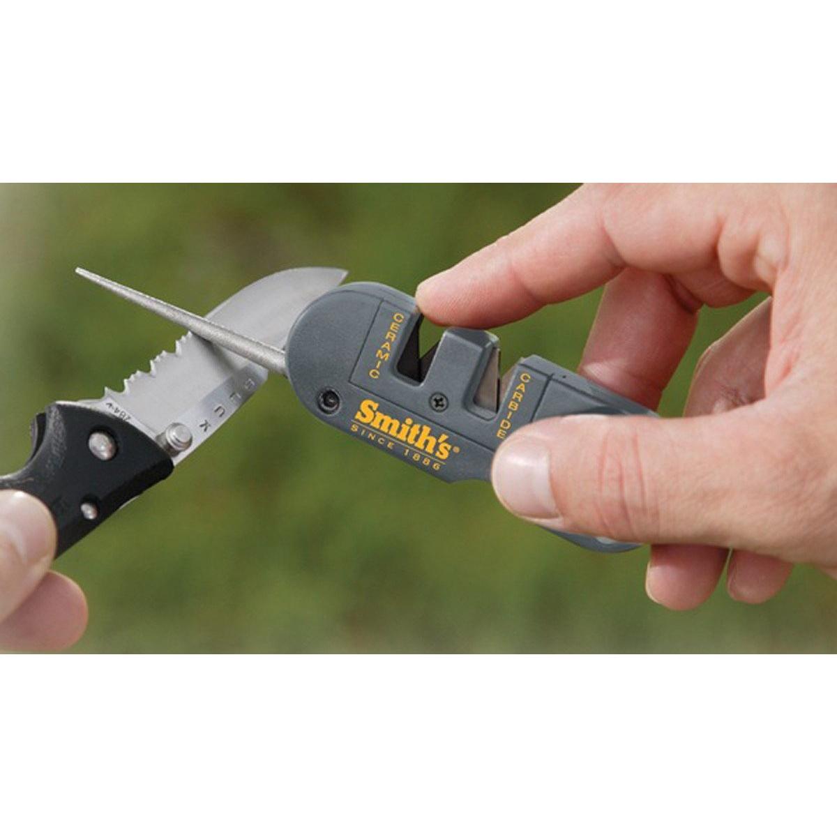 Smith’s new “Pocket Pal” Multi-Functional Knife Sharpener features pre-set crossed carbides and ceramic stones, which provide the “Perfect Edge” every time. Carbides provide quick edge setting, and the specially shaped ceramic stones are designed to give you a razor sharp edge on either standard or serrated edges. A fold out, tapered round, diamond coated rod is designed for sharpening serrations and small gut hooks. Unit is compact, lightweight, durable, and comes with a lanyard hole.