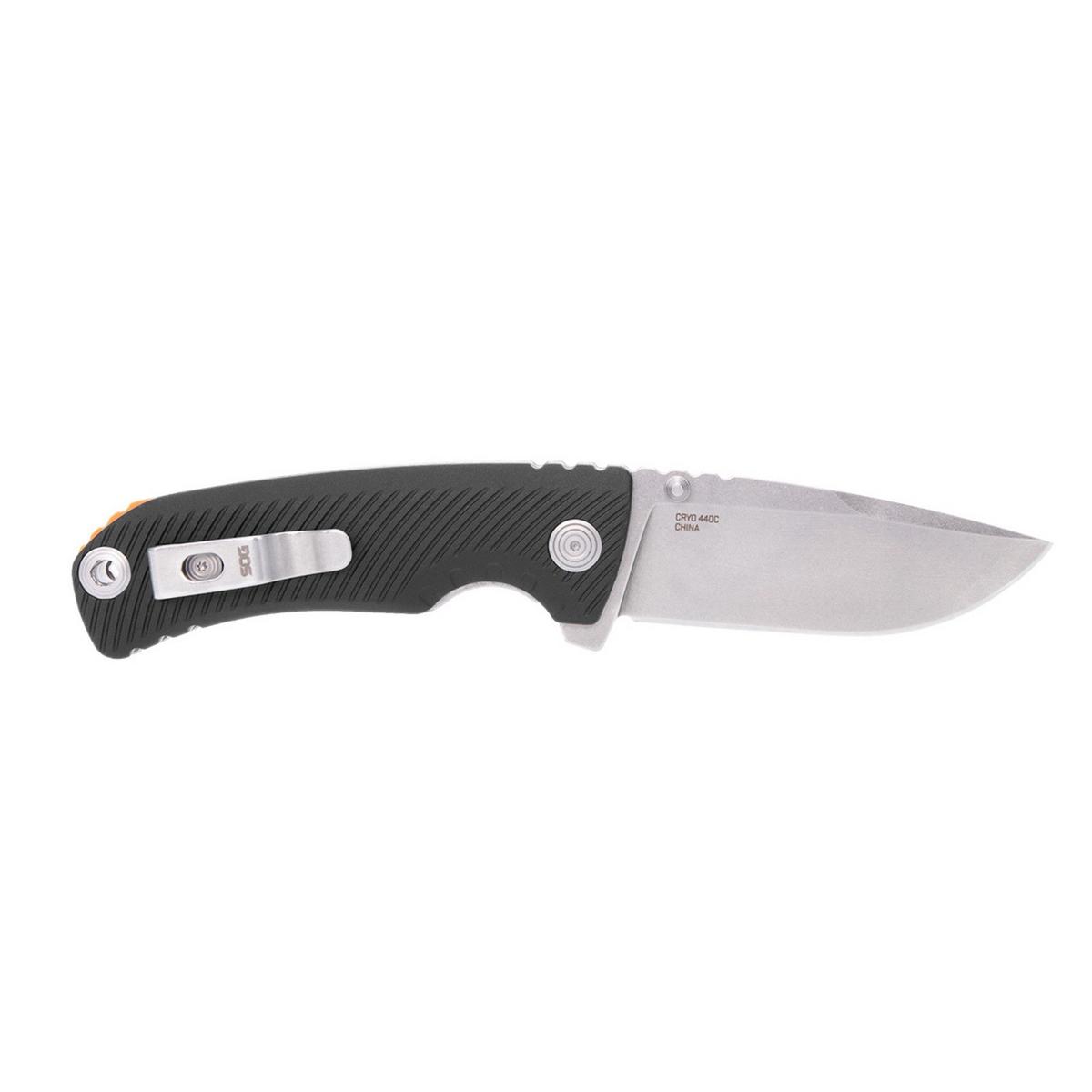 Accomplish outdoor tasks with a single free hand due to Tellus ATK's assisted opening frame lock mechanism. The open frame lock design has been engineered to mitigate the effects of dirt, mud and other debris that can foul more complicated systems and the blade locks on to the sturdy metal frame and simulates the strength of a rugged fixed blade knife. The deep belly CRYO 440C stainless steel blade provides plenty of backbone to this outdoor workhorse while offering a sharp and durable edge. The GRN handle is durable and textured to provide a sure and safe grip in the wet or dry, with gloves and without. Item SOG-11-06-02-43