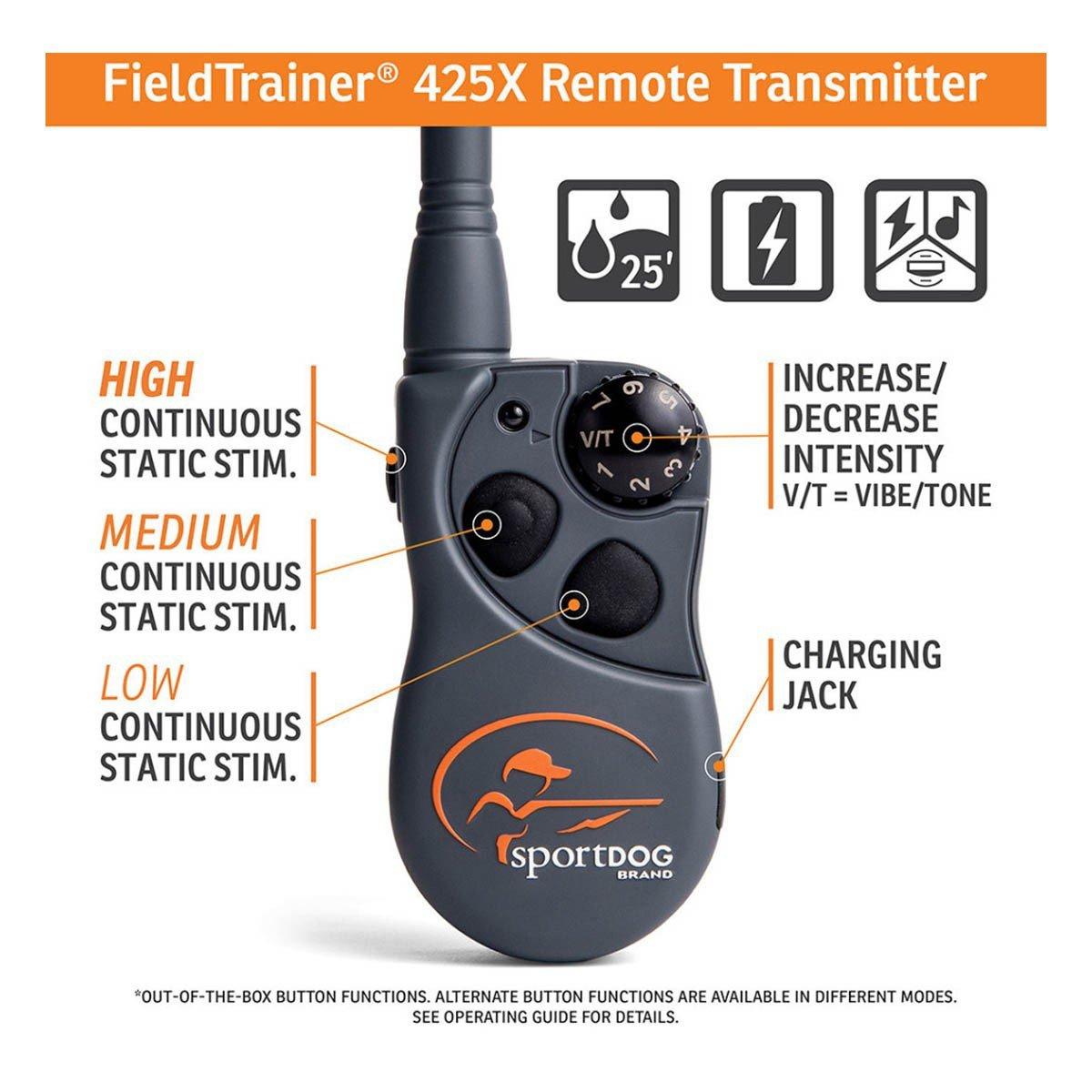 The SportDOG FieldTrainer 425X Dog Training Collar is the smallest and lightest electronic dog collar available from SportDOG. This collar provides more levels of stimulation for high drive, more stubborn dogs. Great for in-the-field training or while hunting with close-working dogs, the SportDOG 425X offers 21 levels of static stimulation as well as tone and vibration options for a more customized training experience. The SportDOG 425X remote is easy to operate without having to look so you're able to stay focused on training your companion. Plus, this SportDOG 425X has a range of up to 500 yards and is powered by a rechargeable lithium-ion battery for convenience. Make sure you and your hunting companion are ready for the season with the SportDOG FieldTrainer 425X Dog Training Collar.