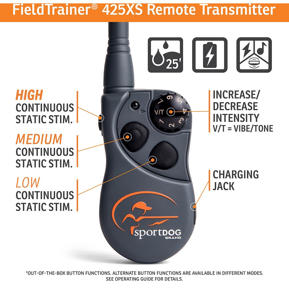 The SportDOG FieldTrainer 425XS Dog Training Collar is super lightweight and small for use while in the field training or hunting with close-working dogs. Ideal for high-drive, more stubborn dogs, the SportDOG 425XS model offers a higher static stimulation range than the original version. With a slight turn of the dial and a push of a button, the SportDOG 425XS delivers one of the 21 levels of static stimulation, tone, or vibration depending on your dog's temperament and training routine. The SportDOG 425XS has a range of up to 500 yards and can be expanded to three dogs (with the purchase of additional collars). Make sure your high-drive dog is trained for the field with the SportDOG FieldTrainer 425XS Dog Training Collar.