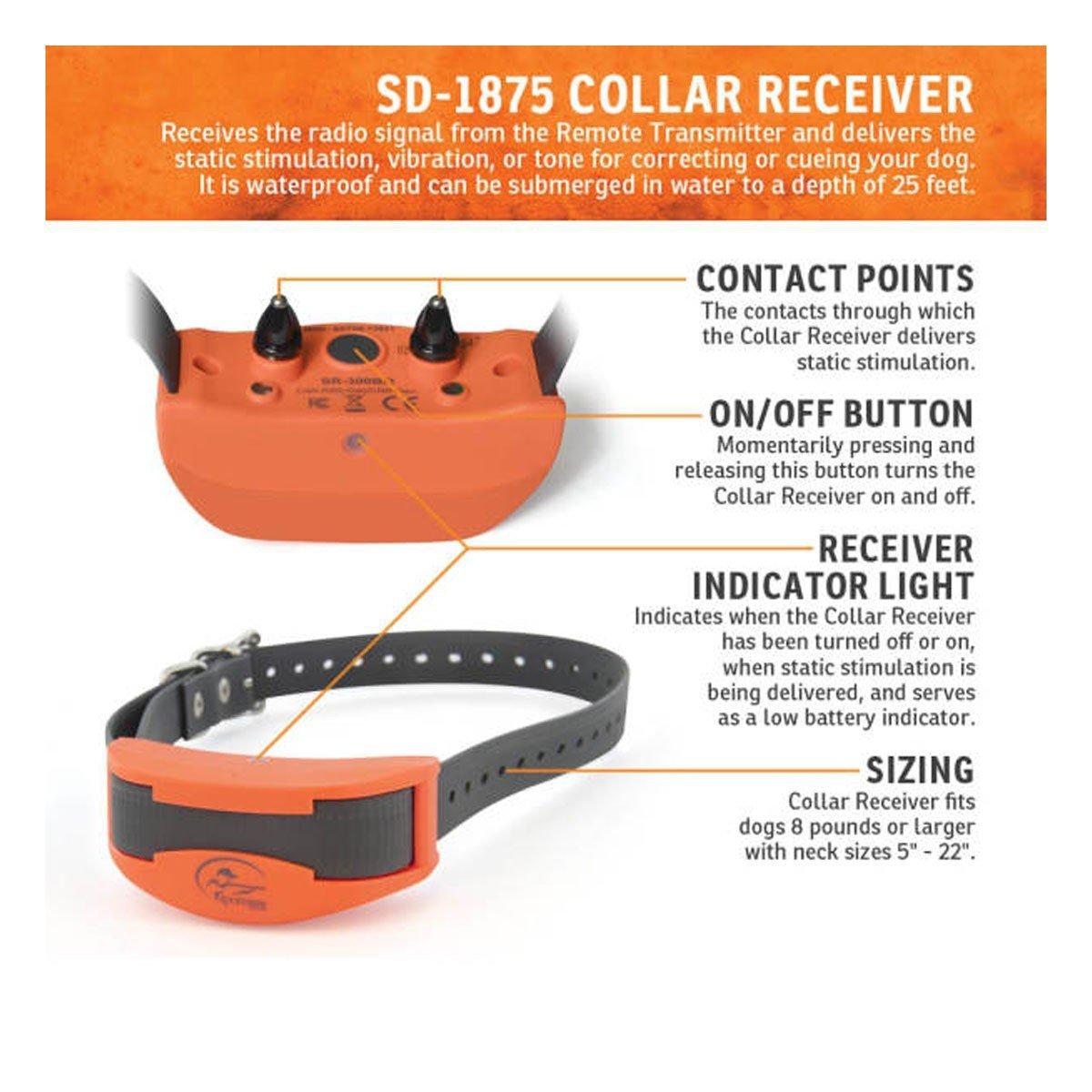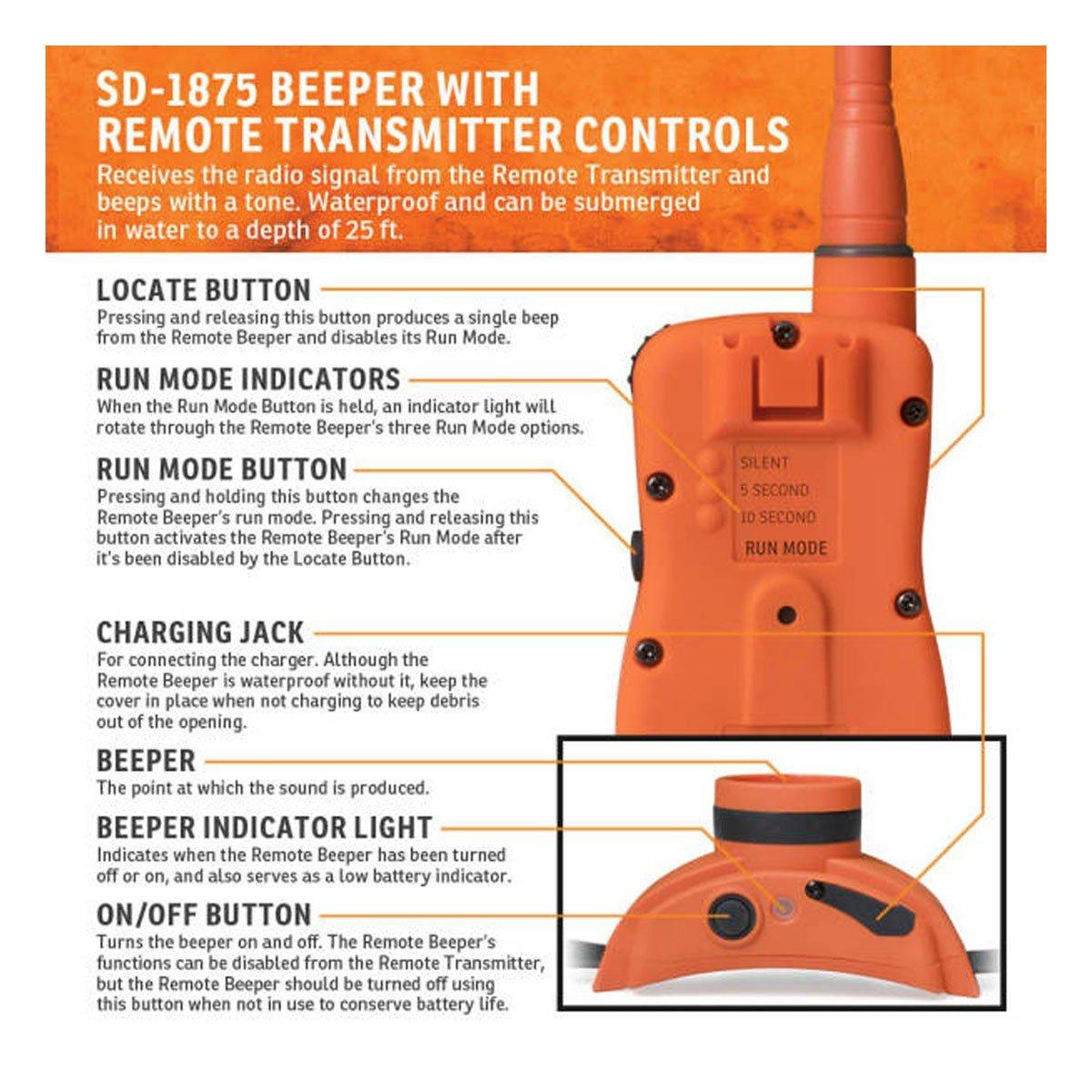 From the big, wide open of the prairie to the thick tangles of the northern alder swamps, the SD-1875 lets you keep tabs on your pointing dogs. This is the pinnacle of SportDOG® efficiency. A situation-programmable Transmitter controls a compact, waterproof Collar Receiver, and at the same time remotely operates a rugged, waterproof, audible beeper. With a 1-mile range and 3-dog expandability, control and flexibility are always at your fingertips.