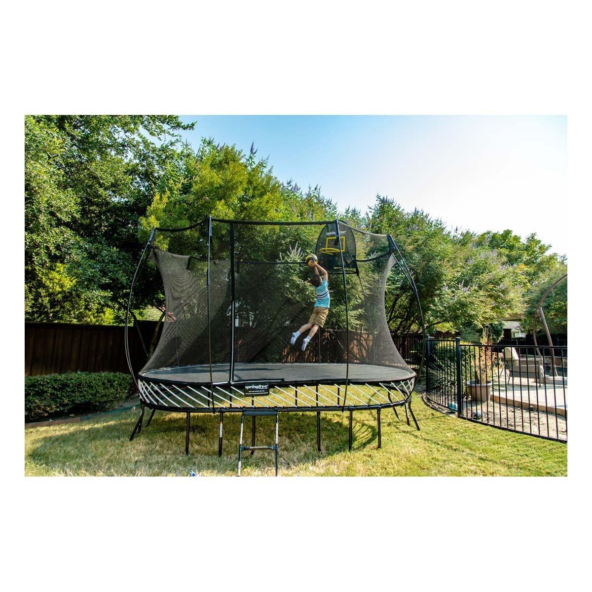The Springfree Trampoline FlexrHoop adds another level of fun to jumping on the trampoline. Built from durable yet soft materials, the Springfree Trampoline FlexrHoop doesn't have any hard surfaces making it the perfect trampoline basketball hoop. Ideal for kids or adults, this Springfree trampoline basketball hoop includes all the necessary components and a neoprene basketball so you can start practicing your slam dunks. Have even more fun this summer with the Springfree Trampoline FlexrHoop.
