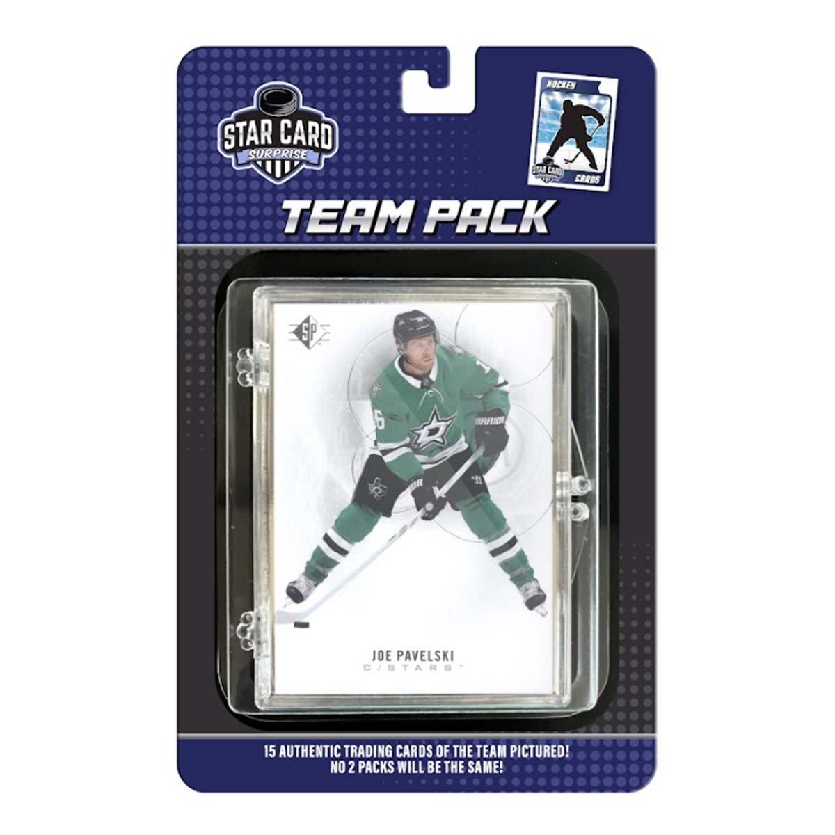 {"reviews":[],"offset":0,"limit":10,"total":0,"gtin":"617723387365"}"Full Description:\nStar Card Surprise Dallas Stars Team 15pk Trading Cards\n\nFeatures:\n\u003cul>\n\u003cli>No two packs are the same\u003c/li>\n\u003cli>Top card shown on pack will vary\u003c/li>\n\u003cli>Contains 15 authentic Dallas Stars trading cards\u003c/li>\n\u003c/ul>\n\n"