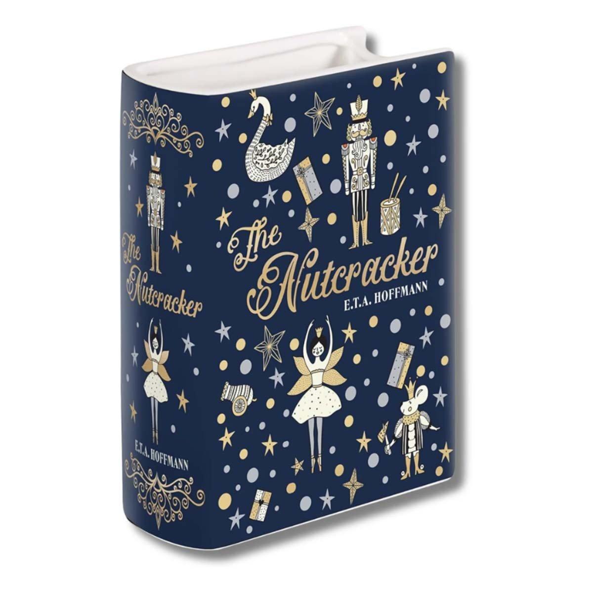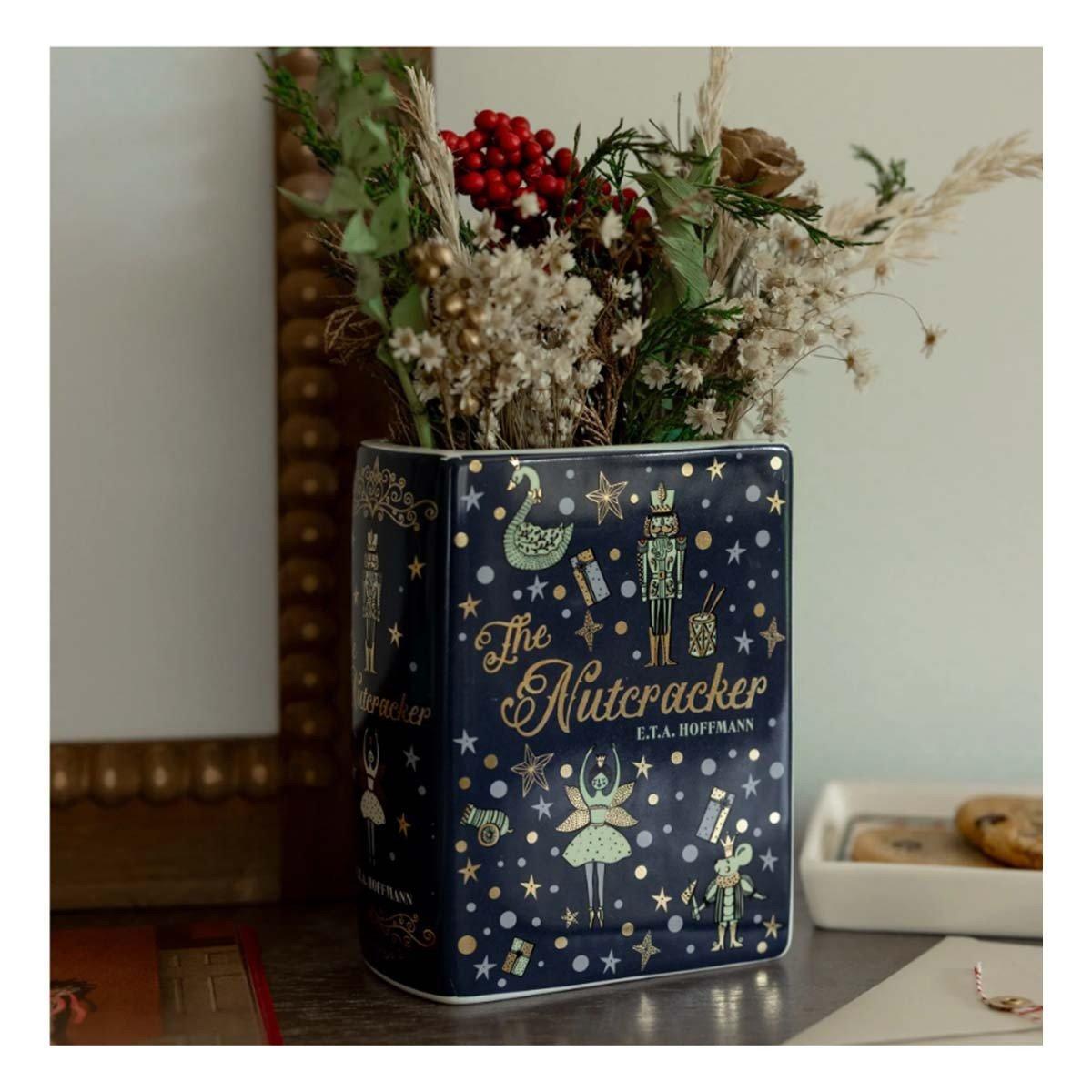 Our small ceramic book vase is the perfect piece for any book lover's space. Designed to mimic a hardcover book, the vase features sculpted pages, with a wide top opening for flowers, desk supplies, bookmarks, and more. The cover features art inspired by The Nutcracker to adorn your space with whimsical and bookish charm.