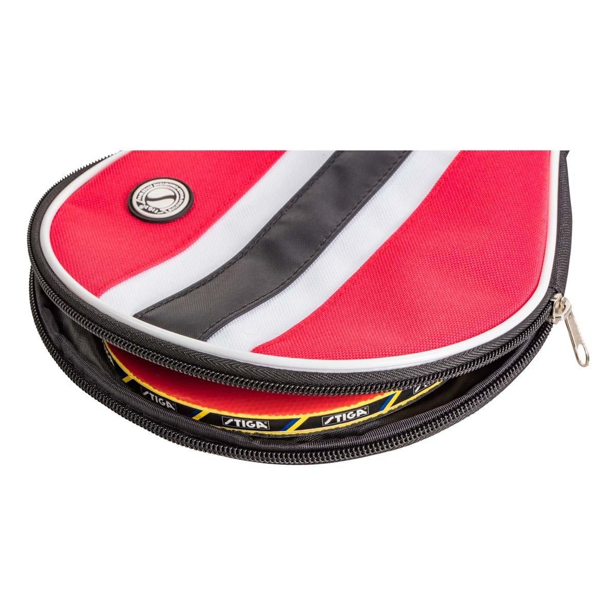 Arrive in style with the Stigma Racket Cover. This durable vinyl cover protects rackets and increases the tact-life of their rubber. Its convenient, oversized design is easy to open and close, even while carrying two rackets. USA Table Tennis (USATT) approved for tournament play.