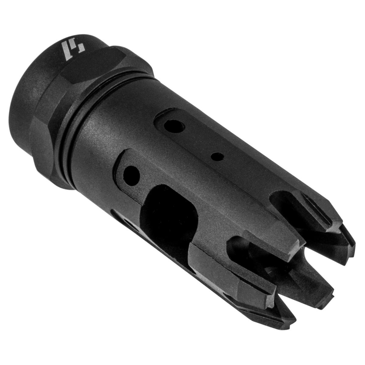 The Strike Industries Mini King Comp 9mm brings the proven performance of the full-size King Comp in a more compact, lighter package designed exclusively for 9mm carbines. The Mini King Comp retains the full range of features of the King Comp in a single chamber format. The large single baffle captures the vented gasses for recoil mitigation. The redirection jets work to stabilize the muzzle end for faster follow up shots while dampening felt concussion on the shooter end to maintain the pleasant shooting characteristics of 9mm carbines. The end of the compensator features the crown of standoff/wire cutting tines that gives the compensator its name.