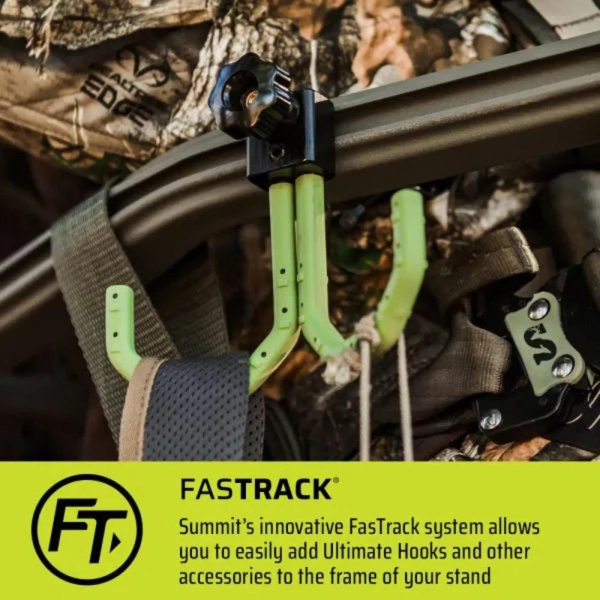 The FasTrack® accessory system features a rail on the top seat frame so that you can keep your gear close while hunting. Easily attach the compatible Ultimate Hook, Phone Holder, or Rifle Holder via one of the four entry ports located on the front and sides of the frame.